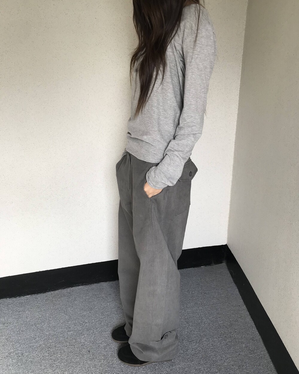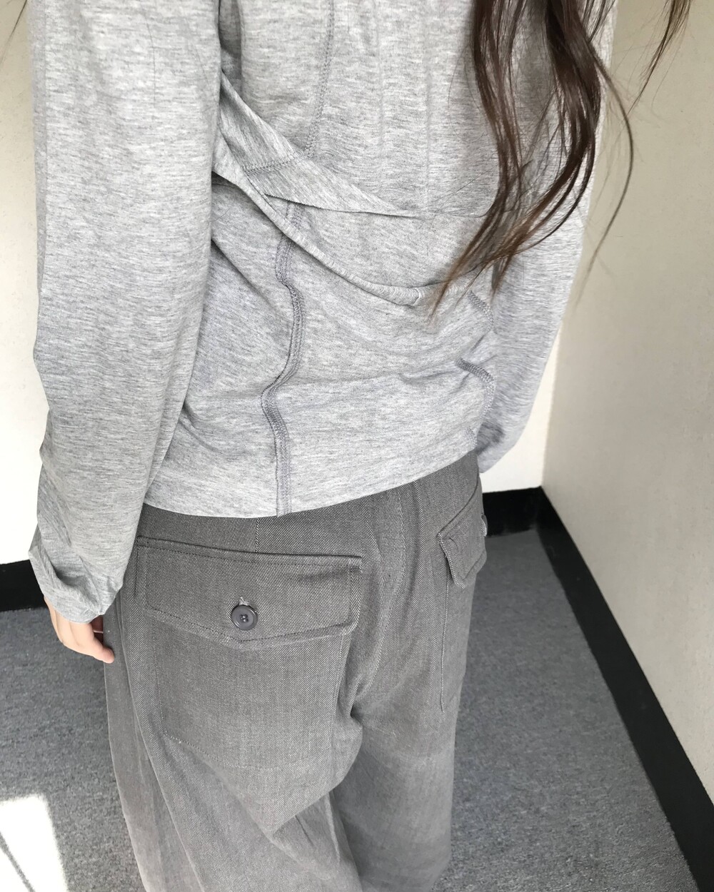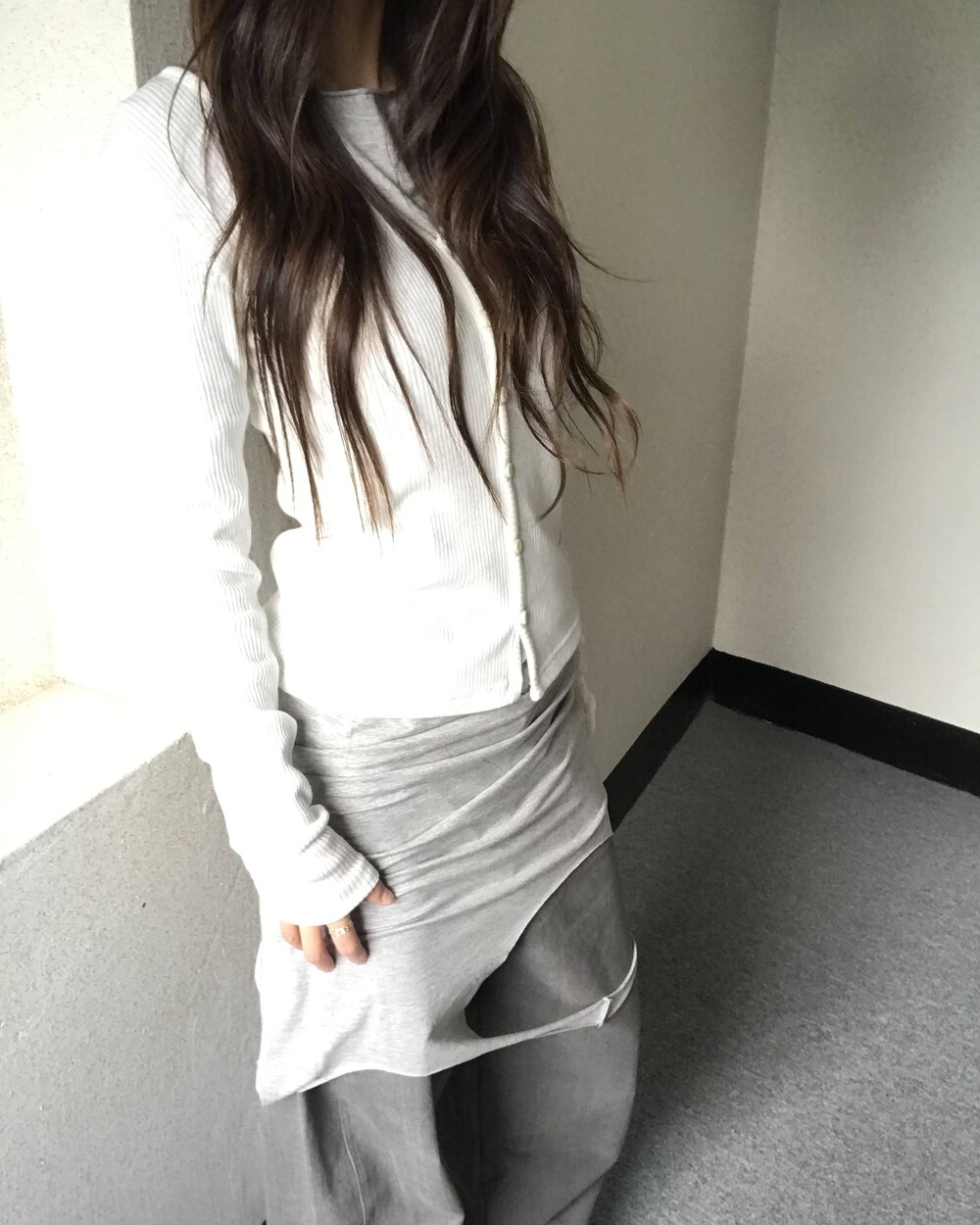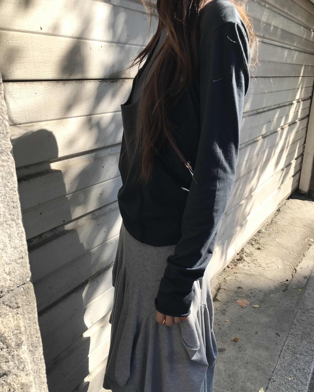 -소재는 얇은 편으로 가벼운 착용감을 주며, 내추럴한 커팅 마감이 더해진 디자인