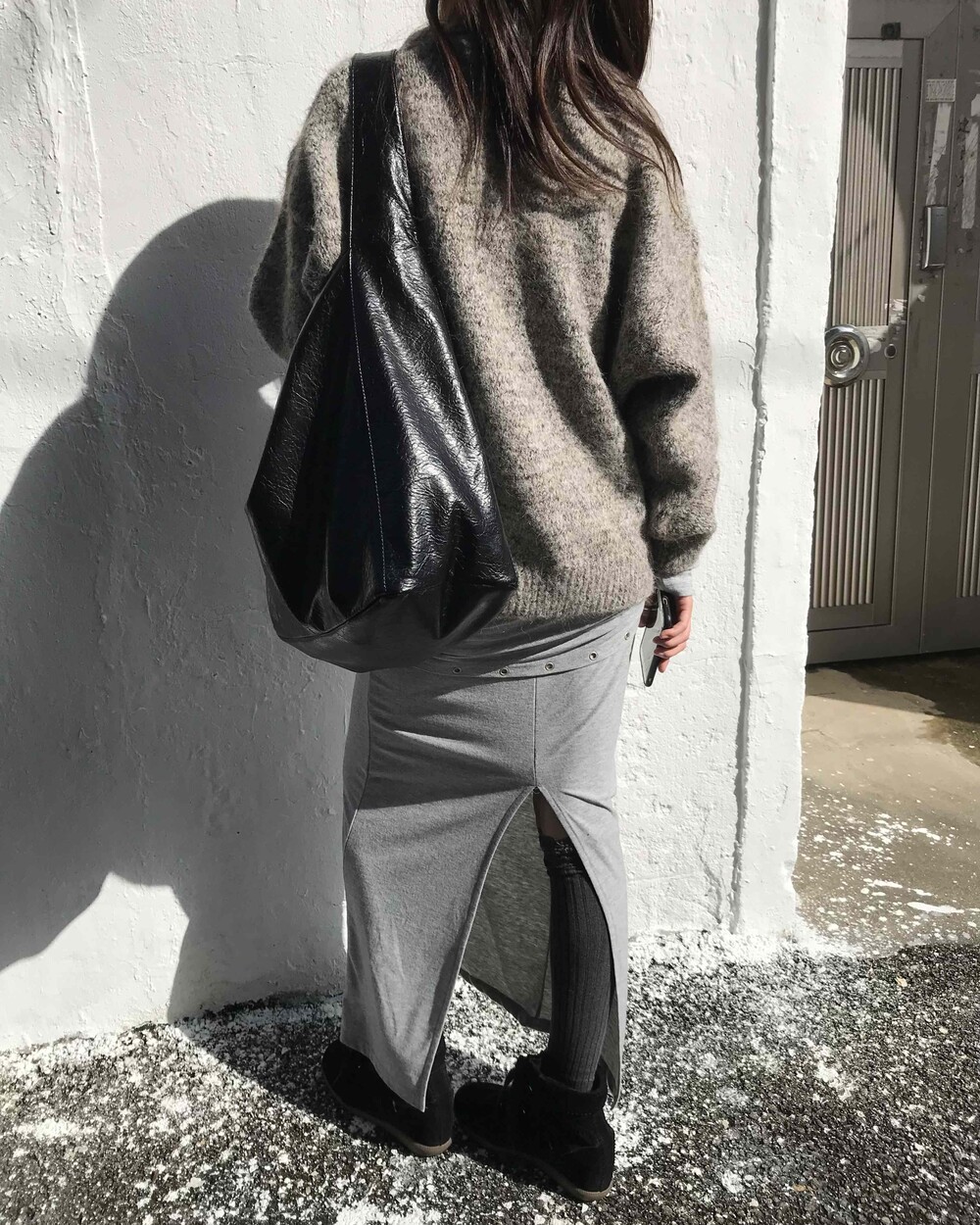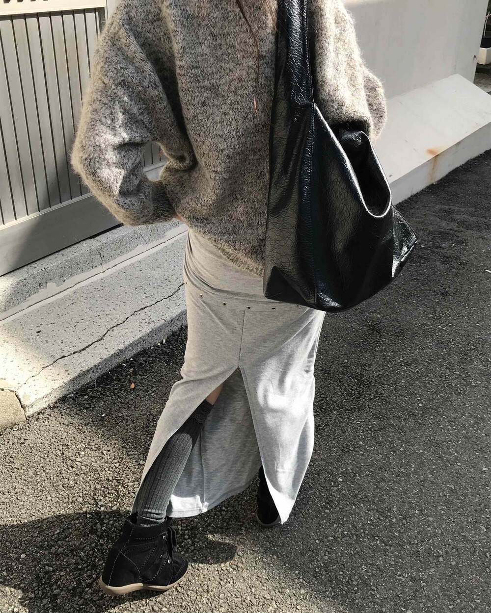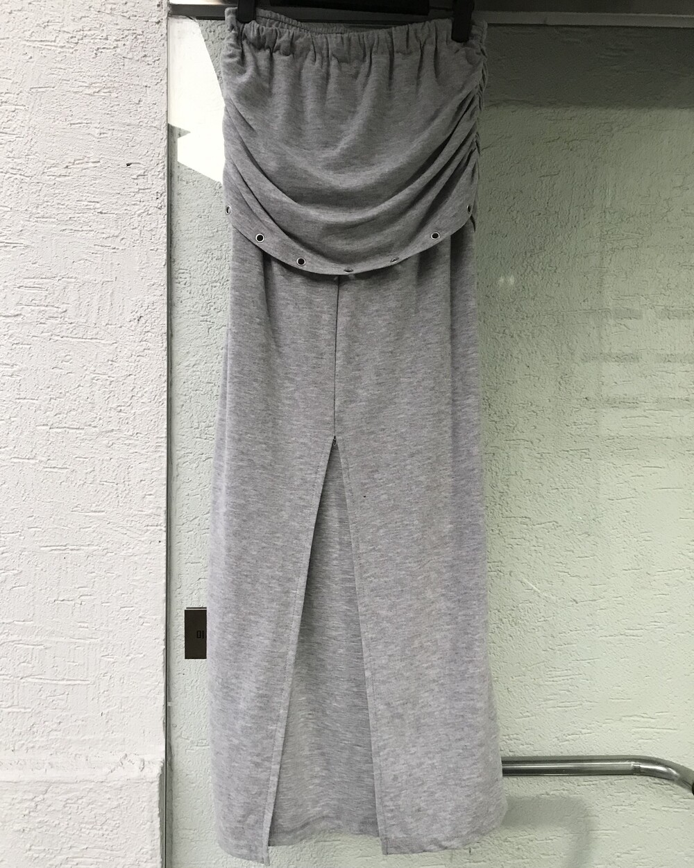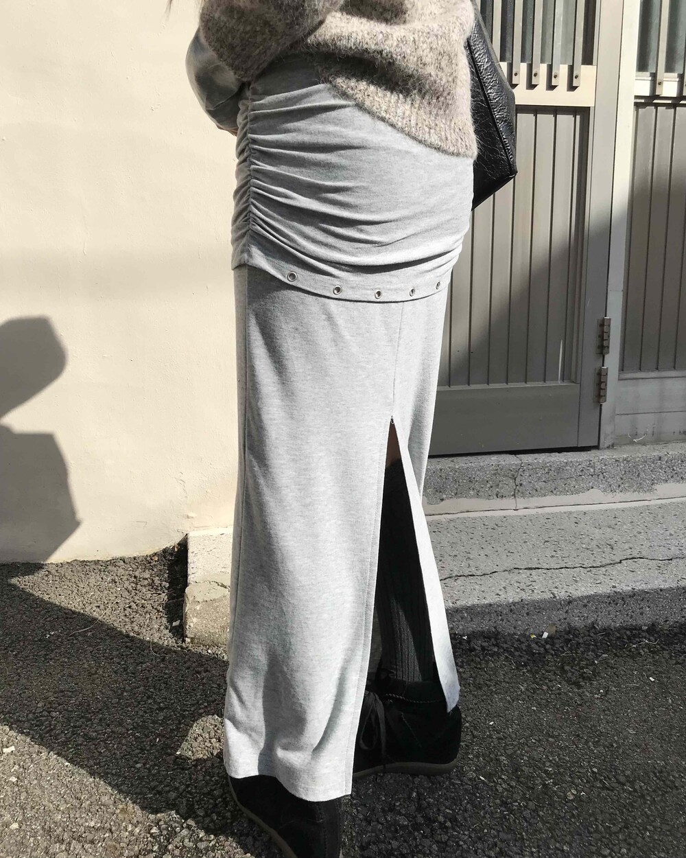 -차분한 그레이 컬러에 허리 밴딩으로 편안하게 착용되며, 뒷트임과 우수한 신축성으로 활동성이 좋은 스커트