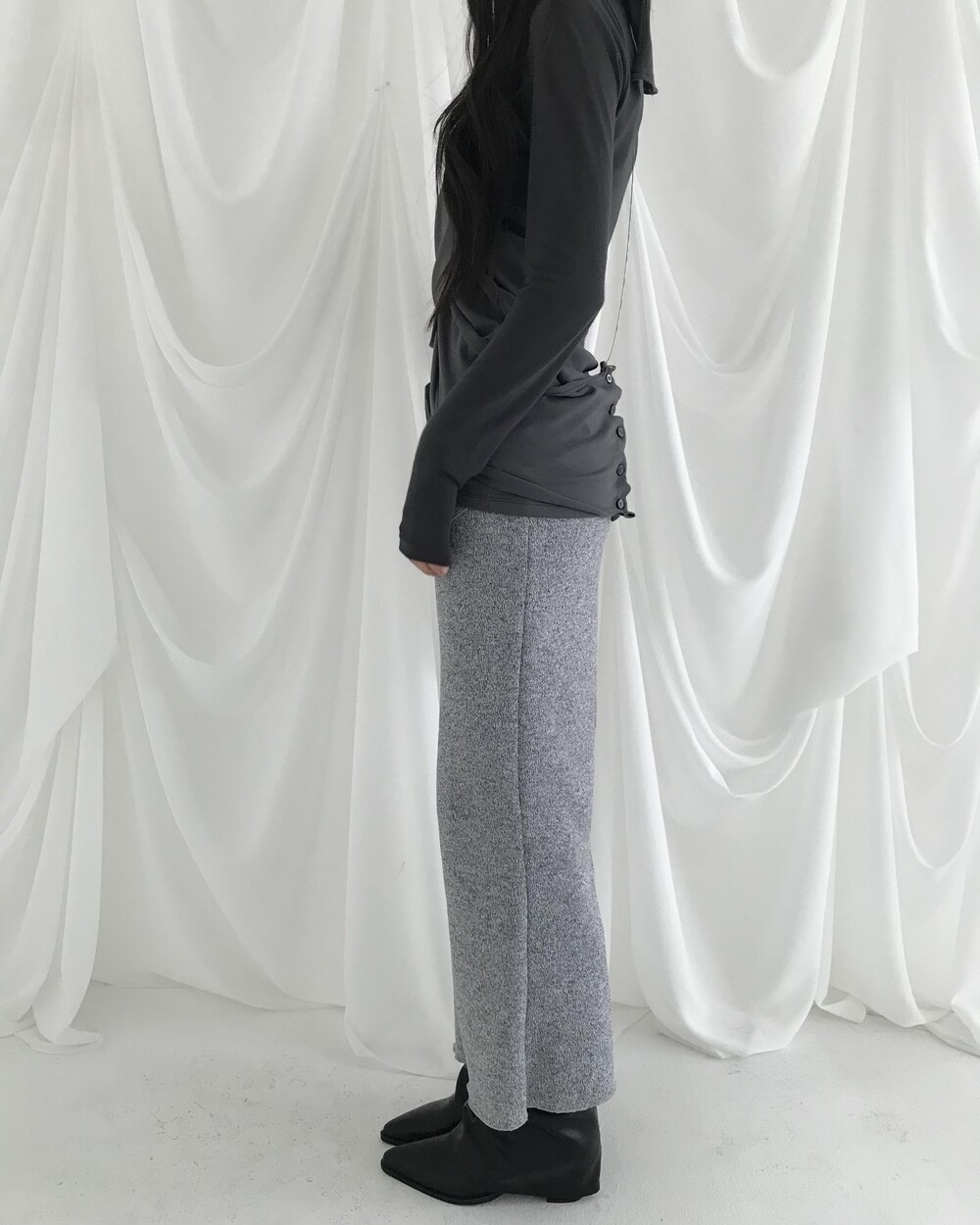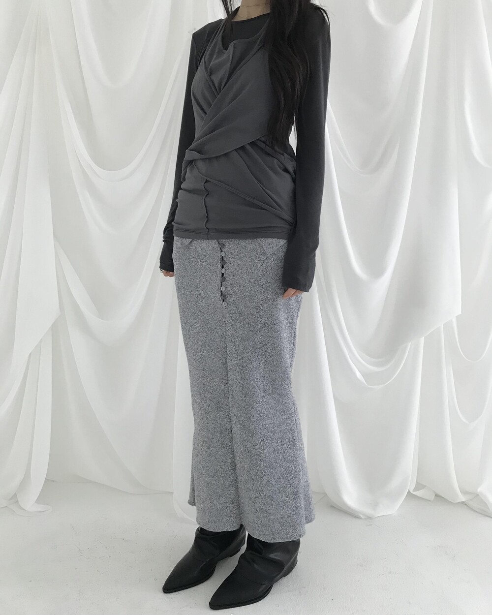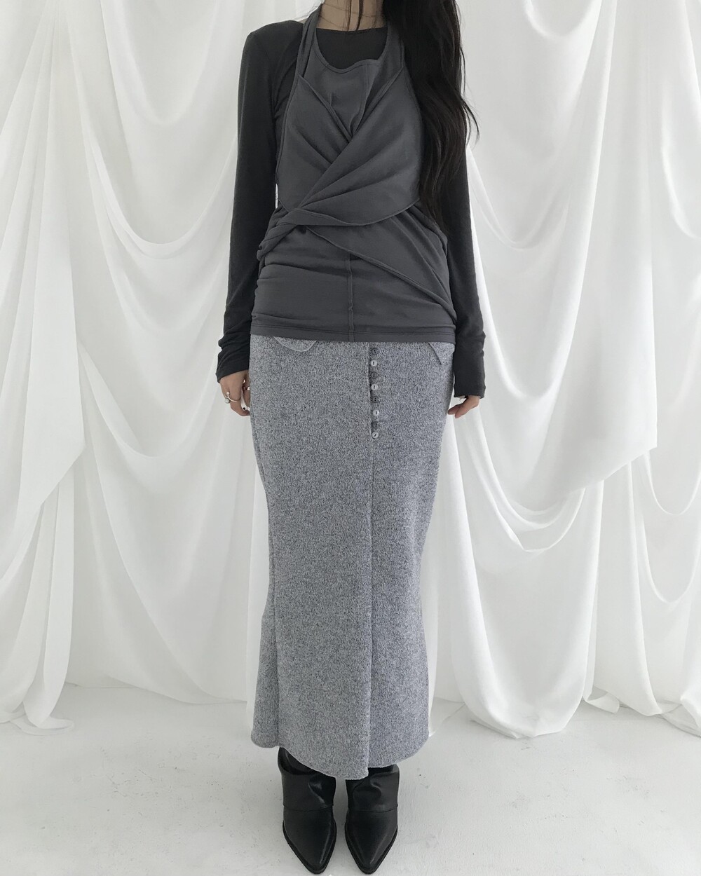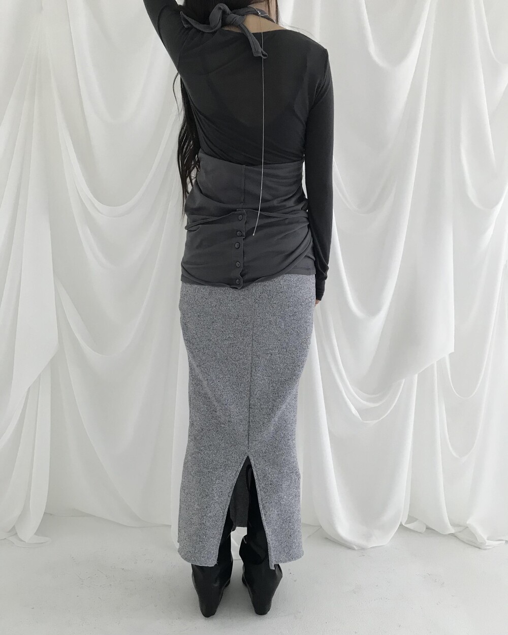 -넥에서 길게 떨어지는 패널 디테일이 스카프를 두른 듯 자연스럽게 흐르는 슬리브리스
