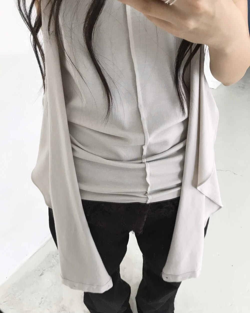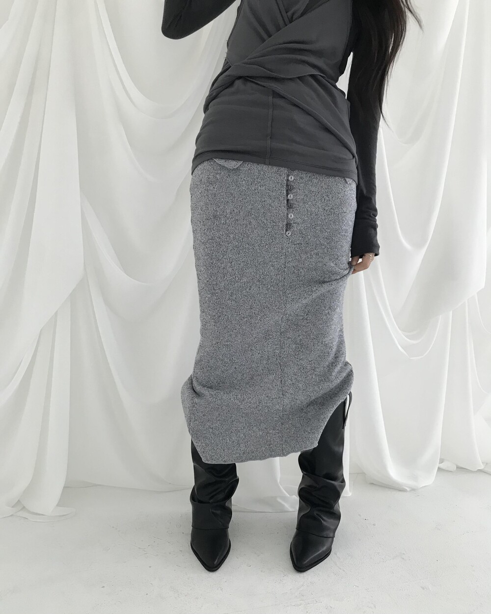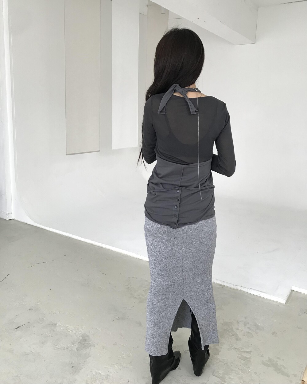 -넥에서 길게 떨어지는 패널 디테일이 스카프를 두른 듯 자연스럽게 흐르는 슬리브리스