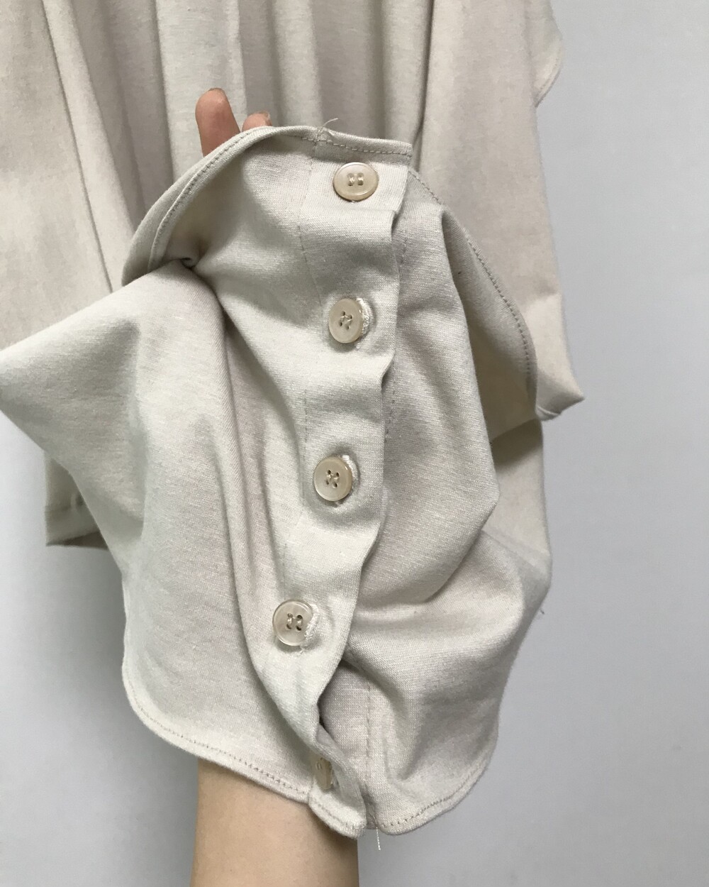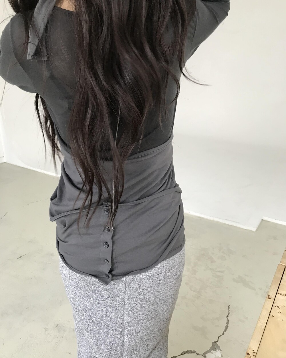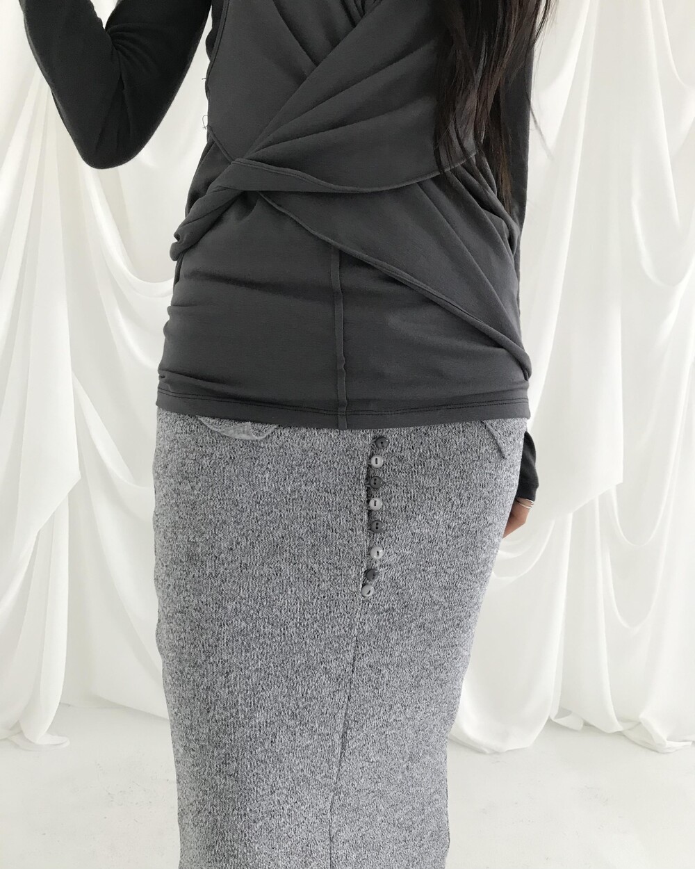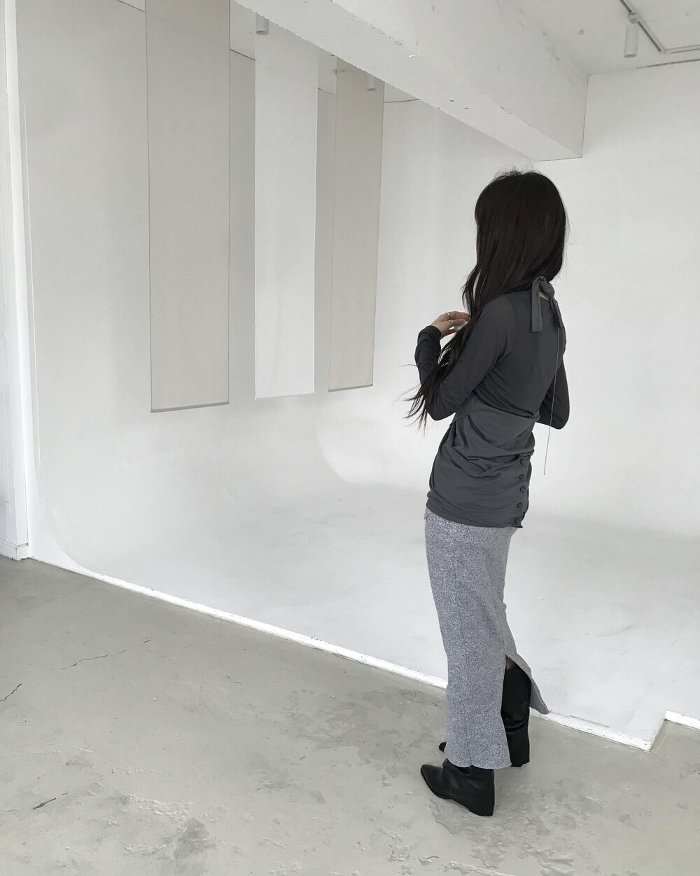 -넥에서 길게 떨어지는 패널 디테일이 스카프를 두른 듯 자연스럽게 흐르는 슬리브리스