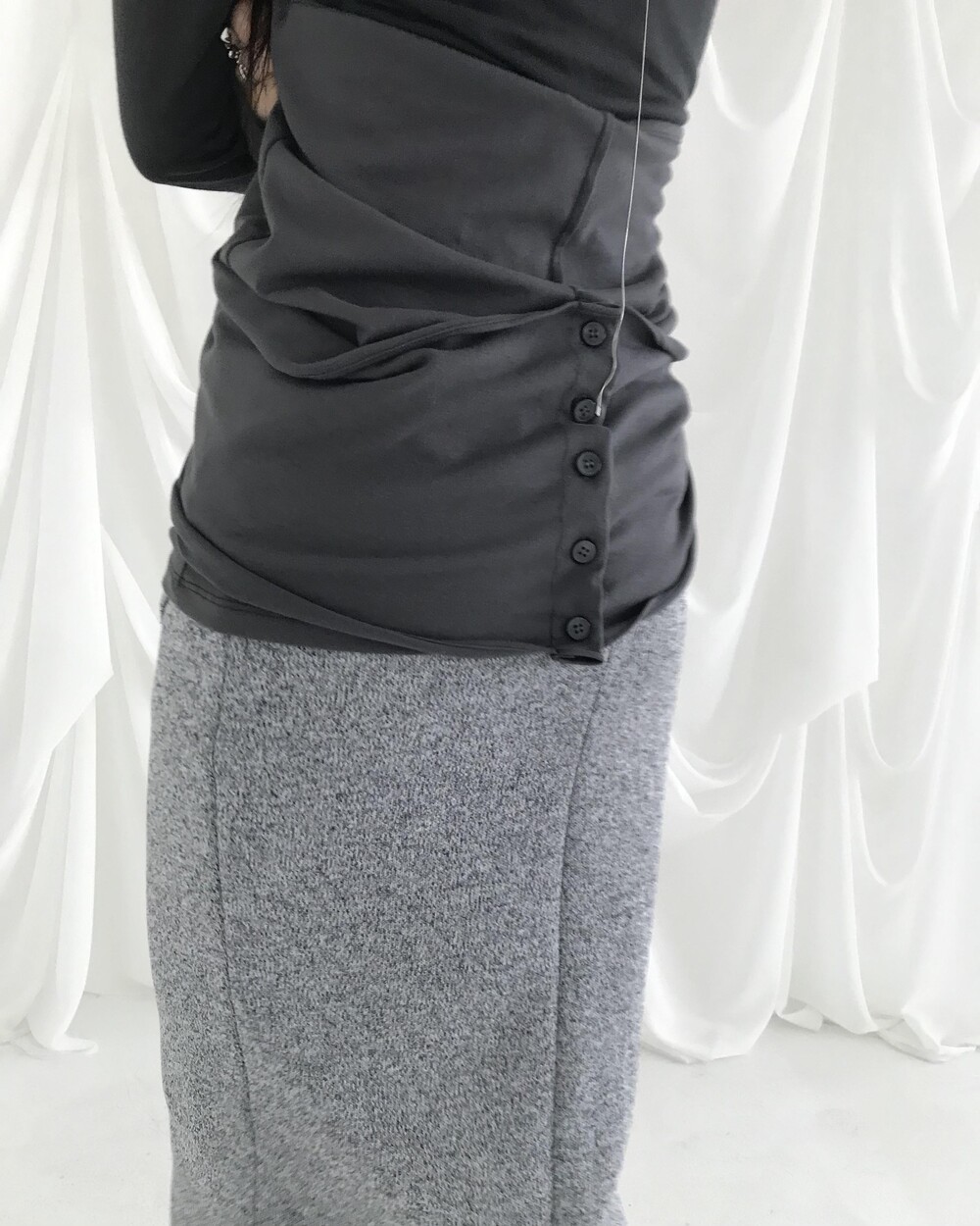 -양쪽 패널 디테일은 버튼으로 오픈/클로징 가능해 풀어 드롭 형태로, 또는 감아 다양한 연출 가능