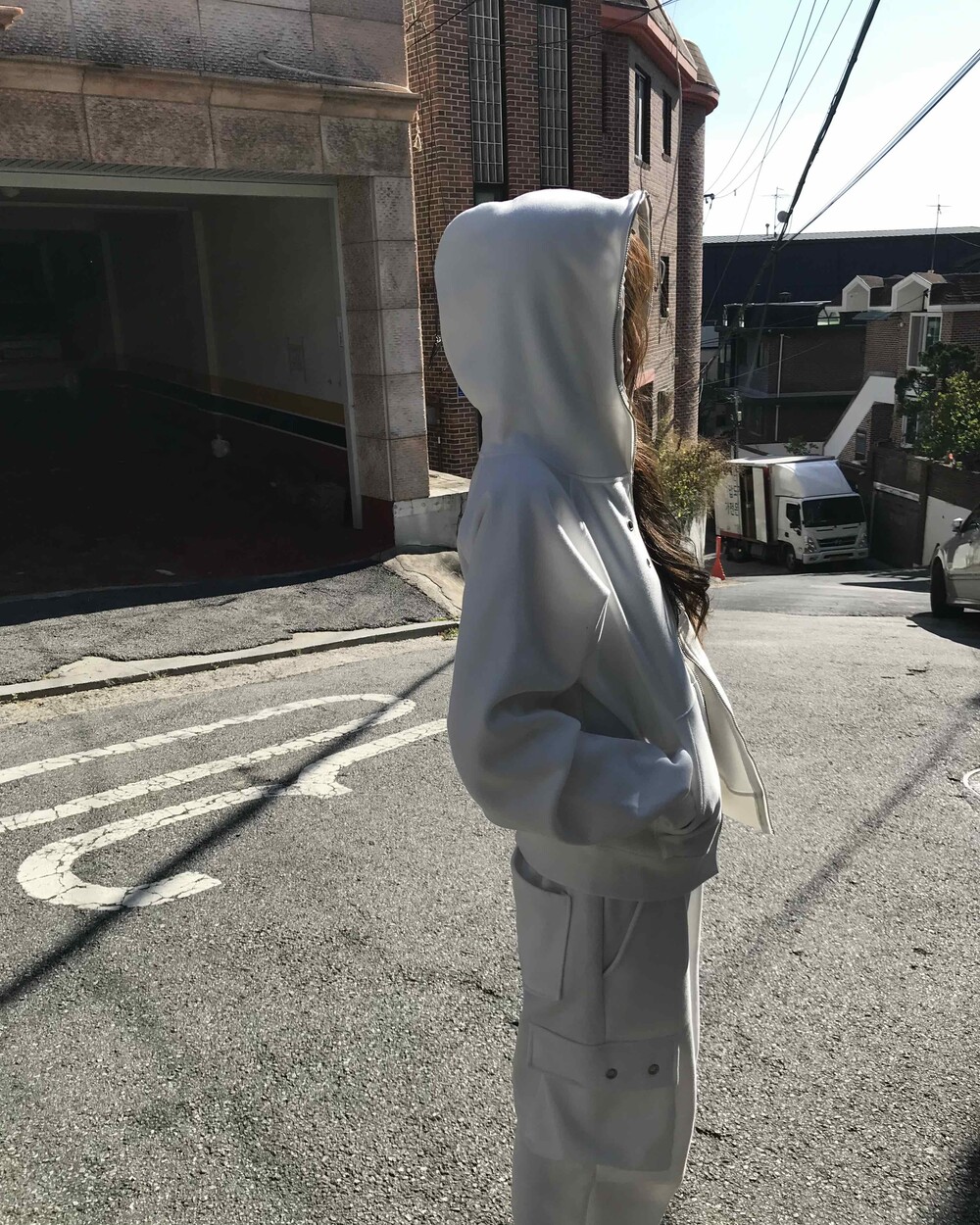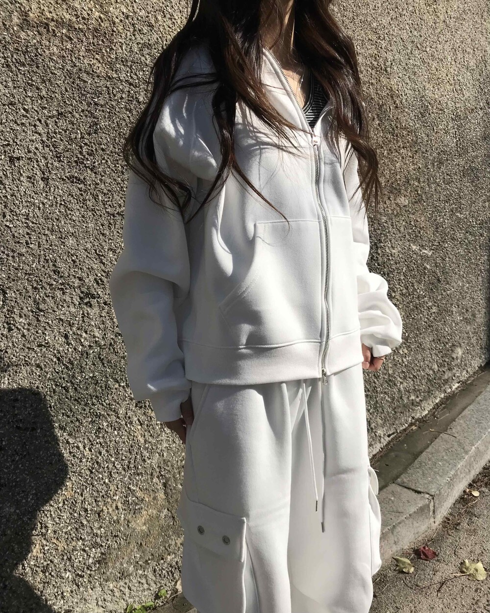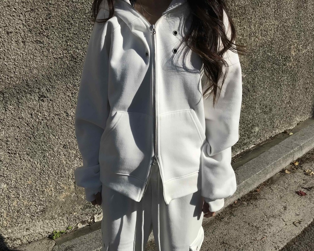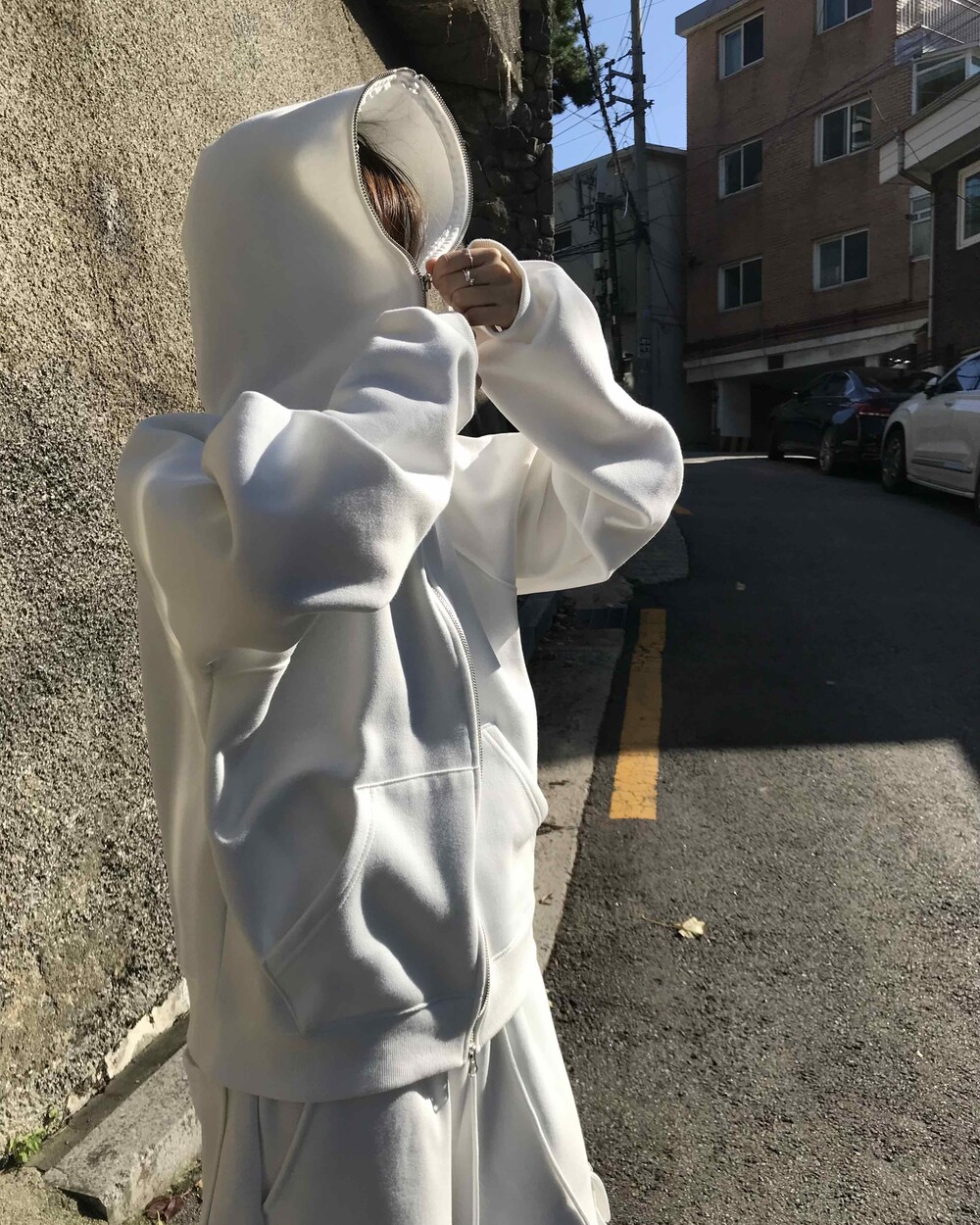 안쪽에 부드러운 기모가 더해진 오버핏의 후드집업 세트입니다.