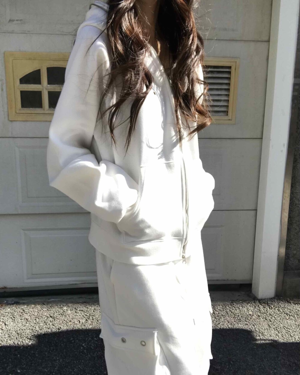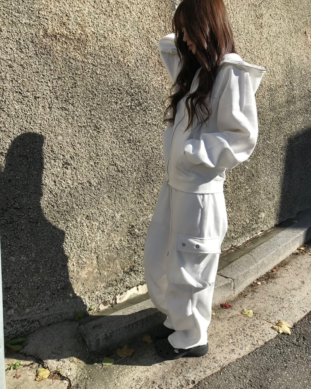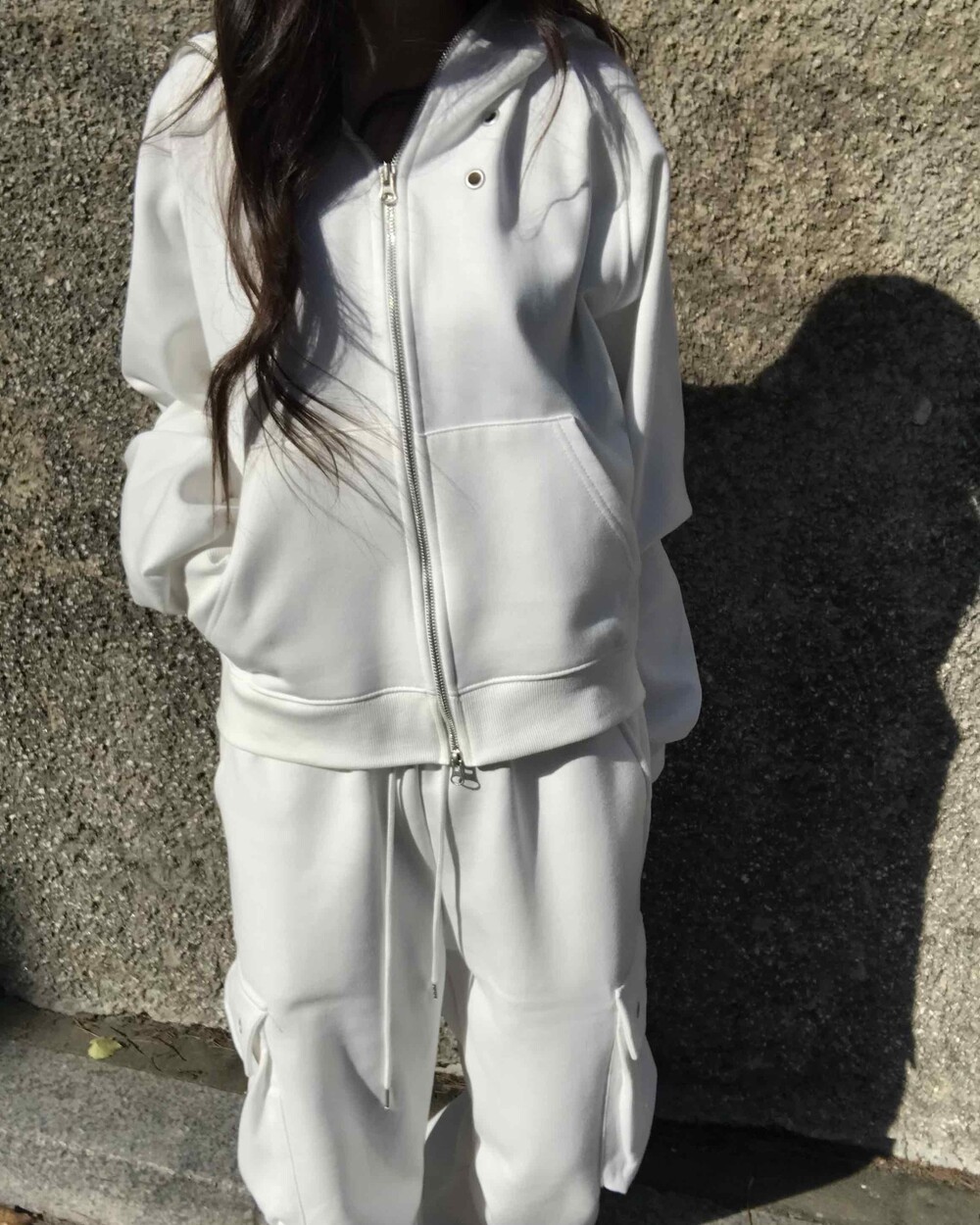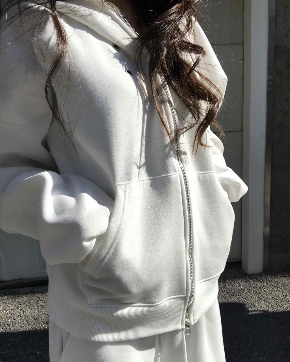 안쪽에 부드러운 기모가 더해진 오버핏의 후드집업 세트입니다.