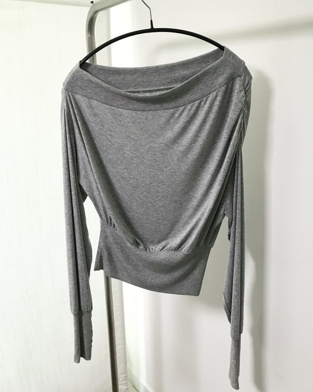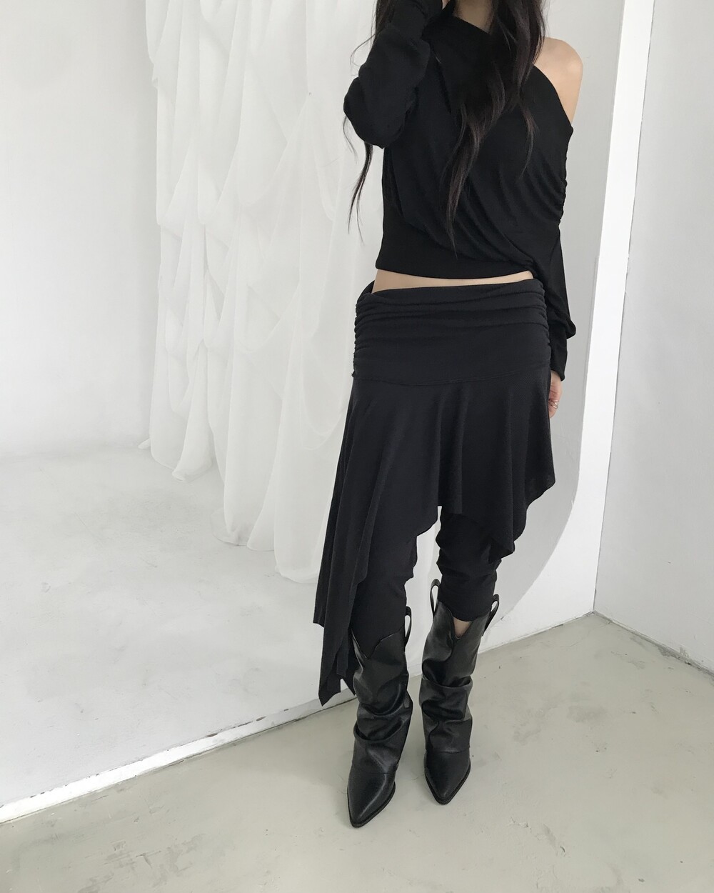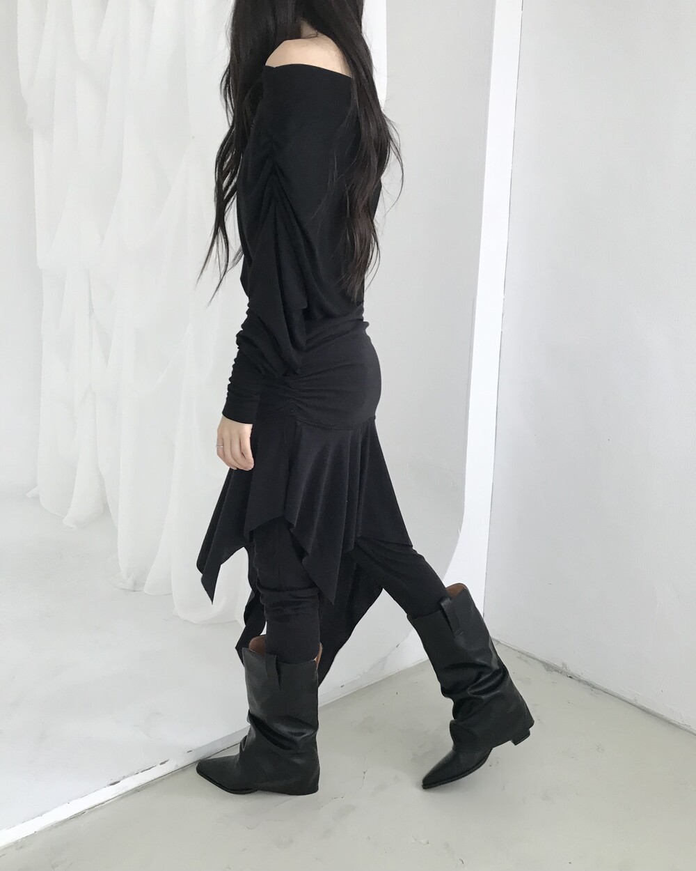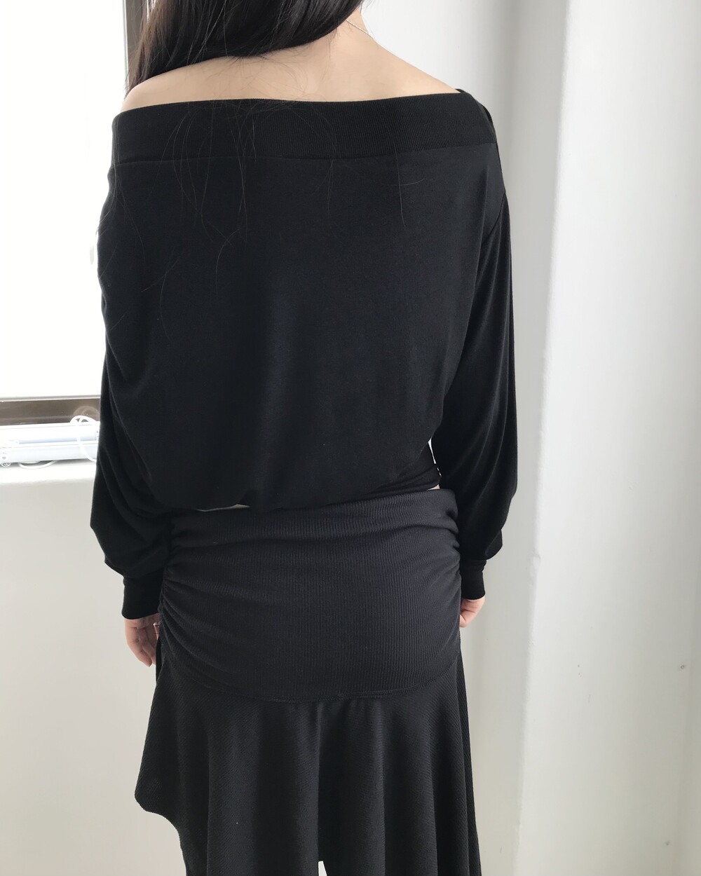 -드레이프 라인이 자연스럽게 살아나는 오프숄더 탑