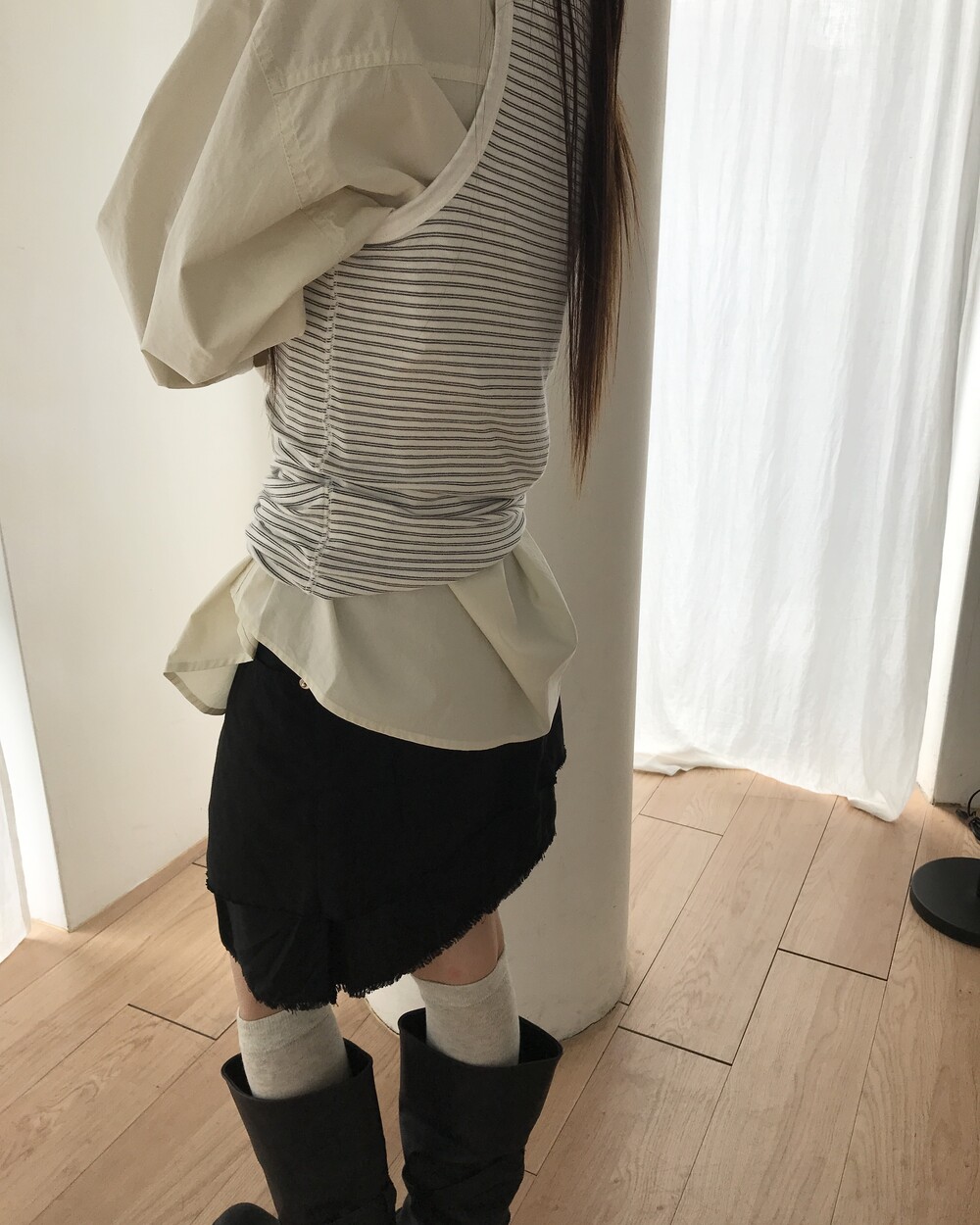 *모델 기준 S 사이즈는 허리 라인에 맞게,