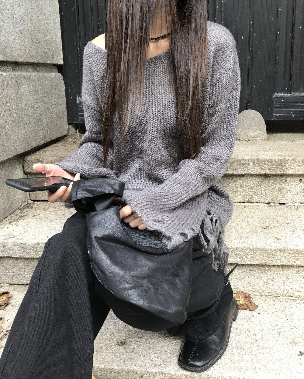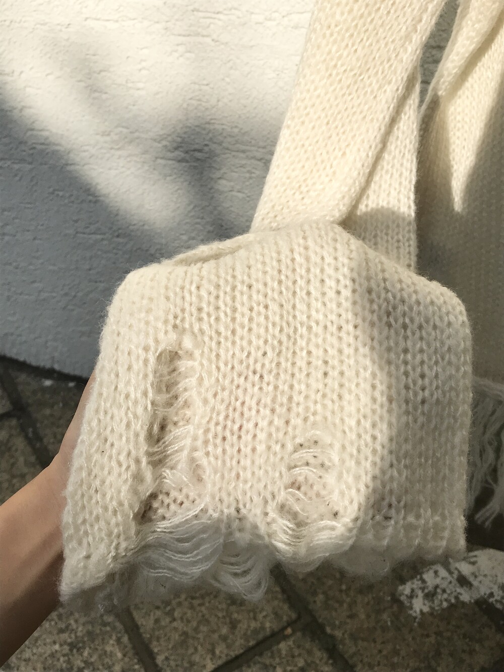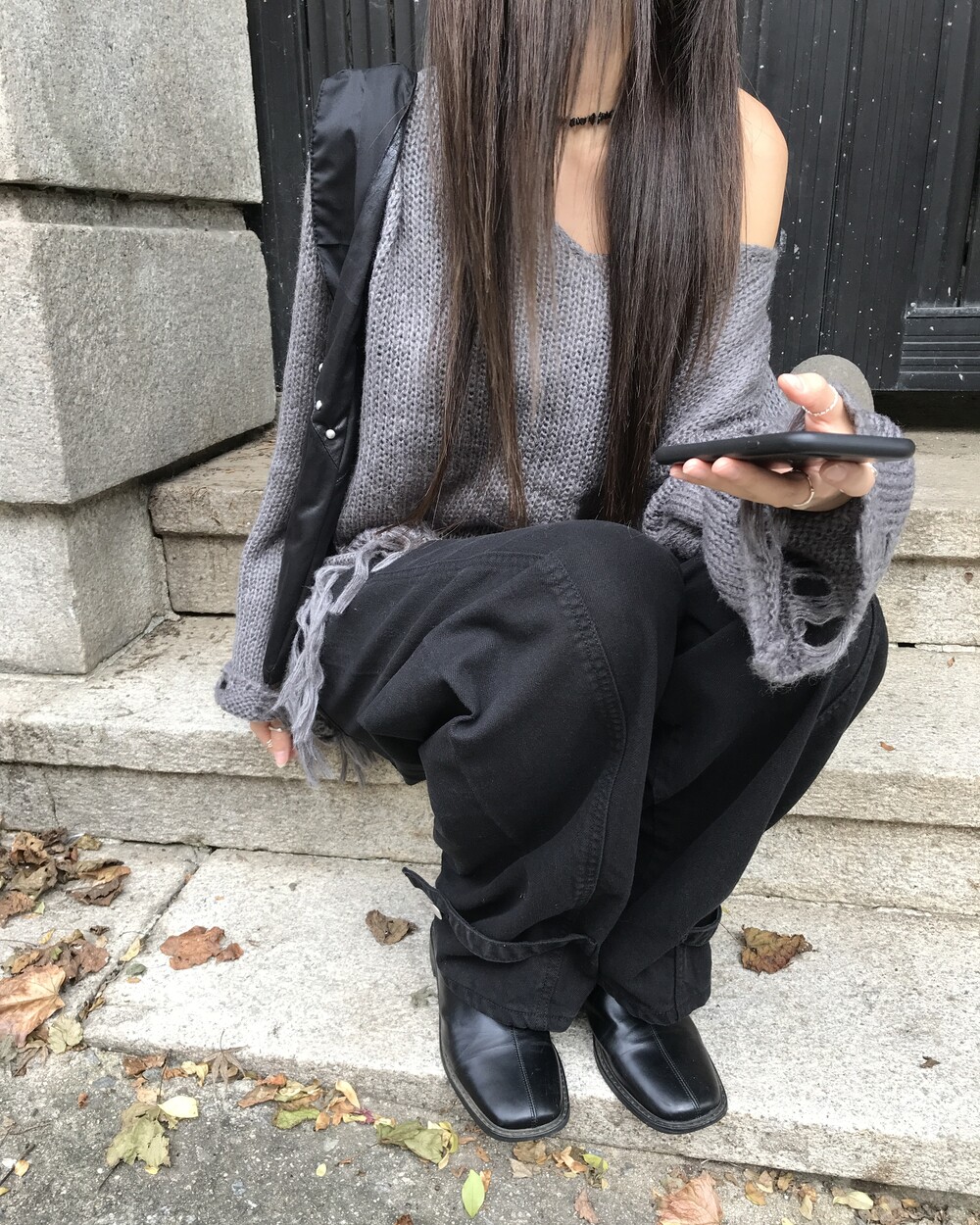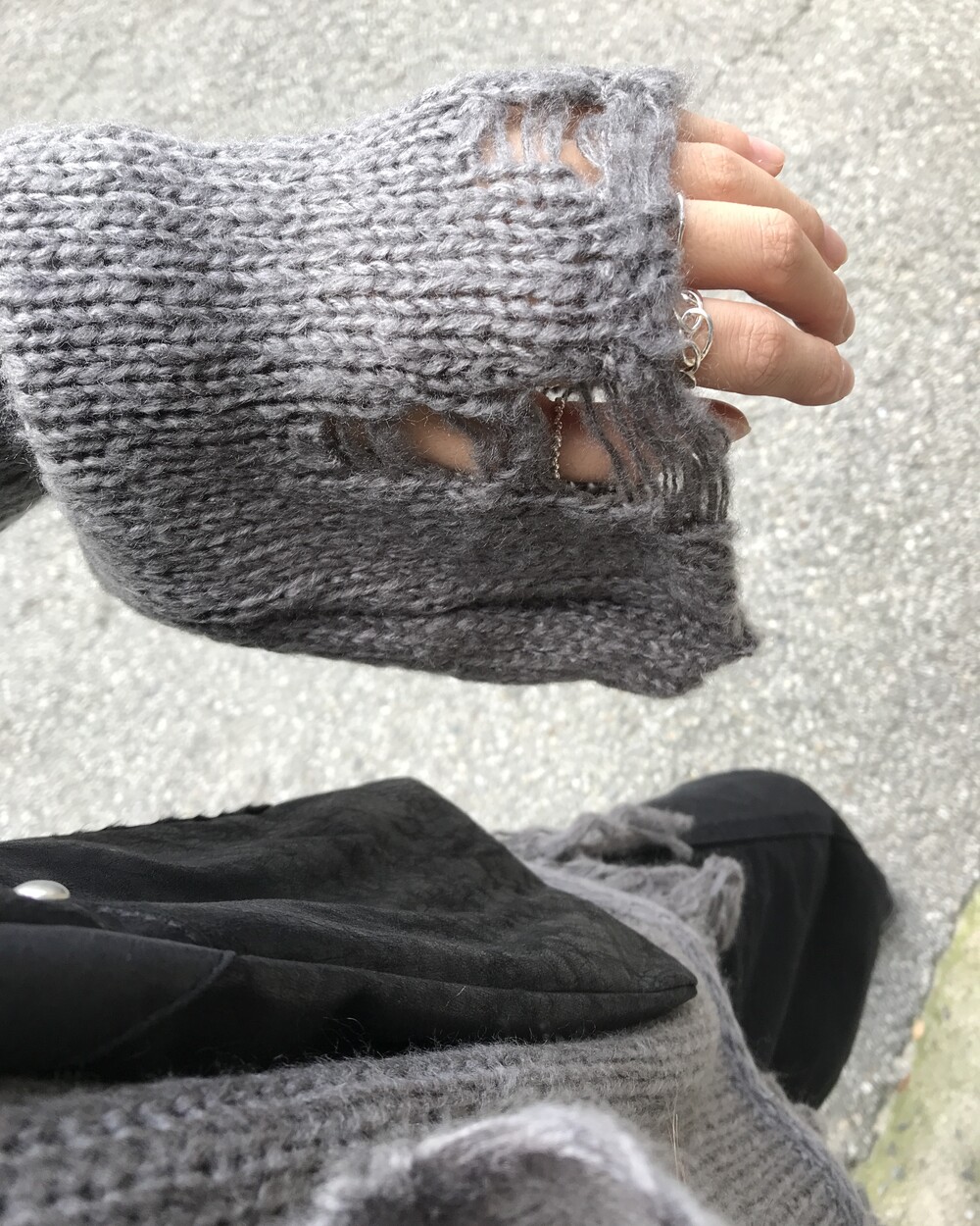 소매 부분의 데미지 니팅 포인트가 빈티지한 매력을 더해줘요.