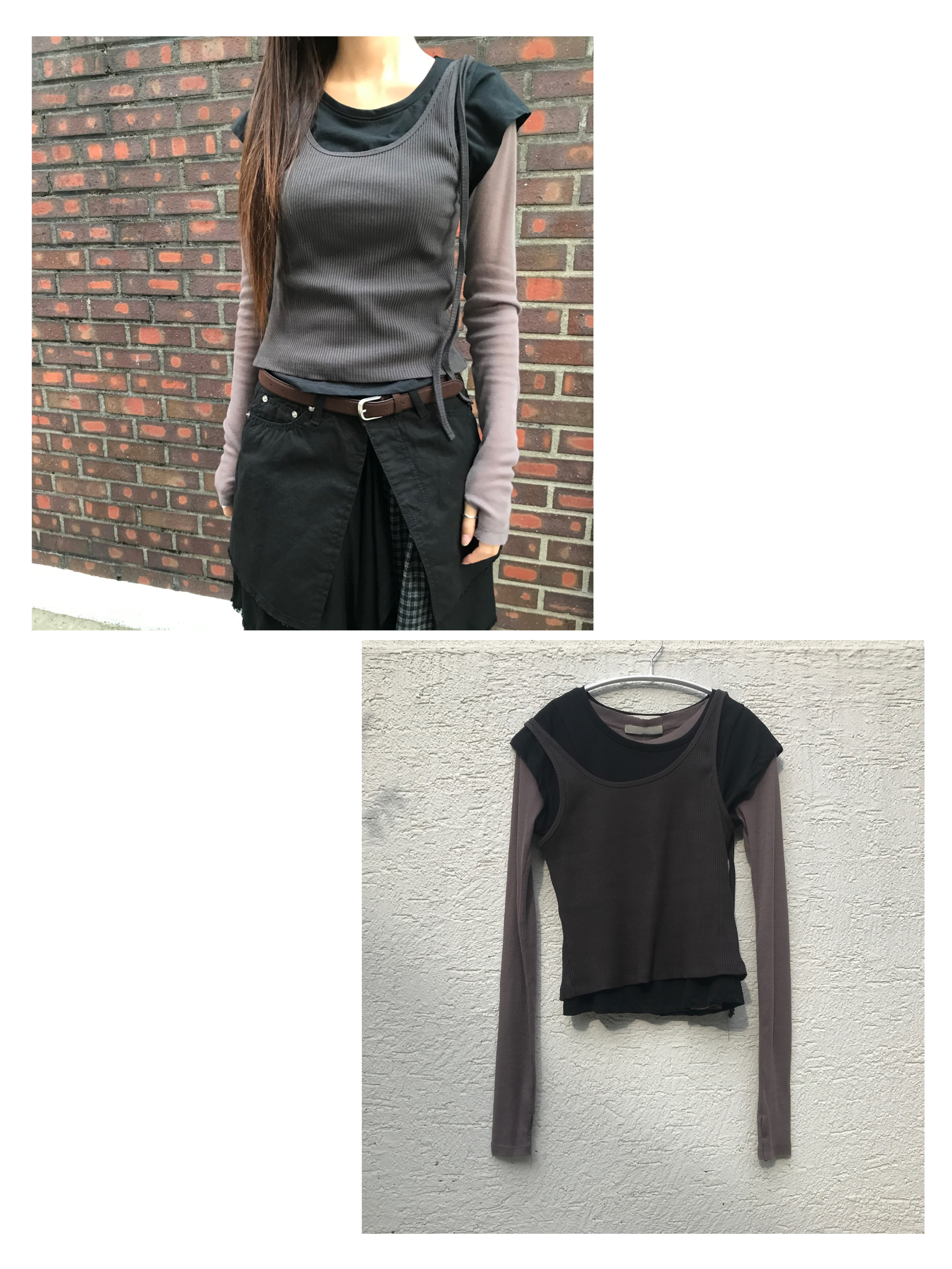 본 제품은 layer half T (black), layer strap tank (charcoal), layer sheer top (mocha)