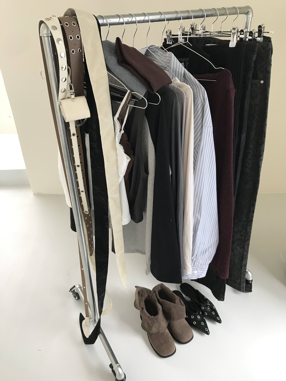 -벨트 스트랩 전체에 아일렛 포인트가 더해져 레이어드 무드 강조