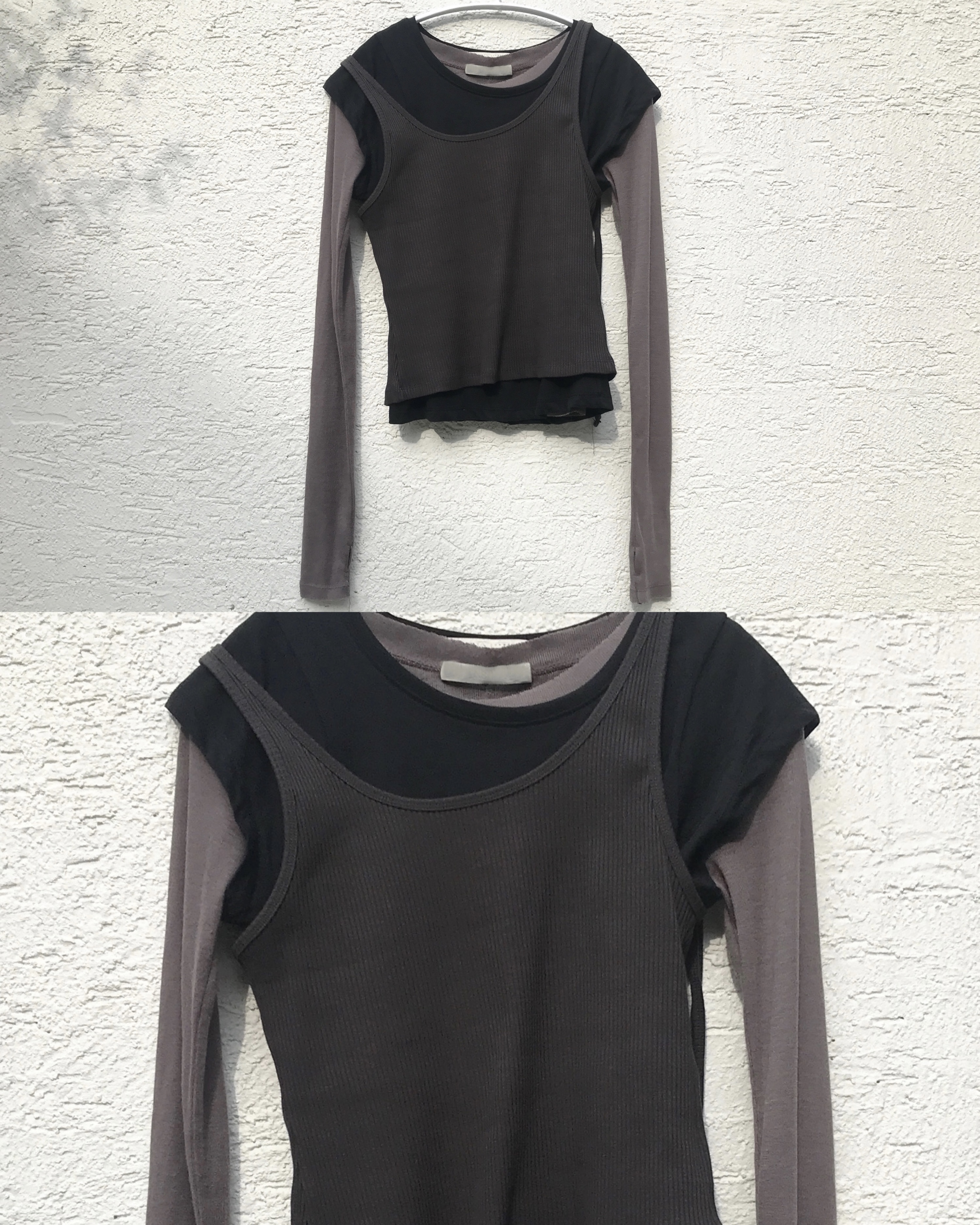 layer half T (black) & layer strap tank (charcoal) & layer sheer top (mocha) 착용