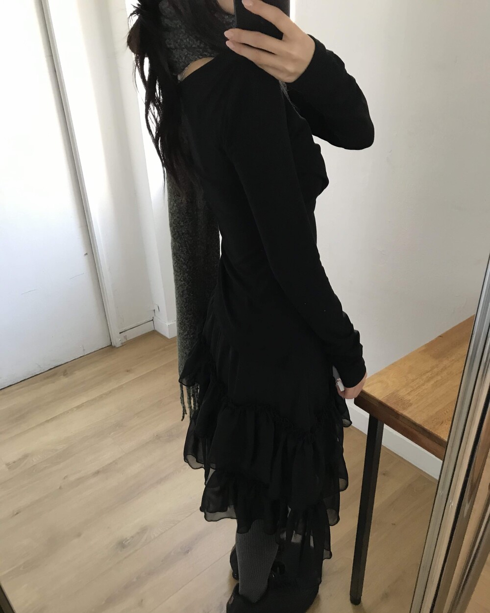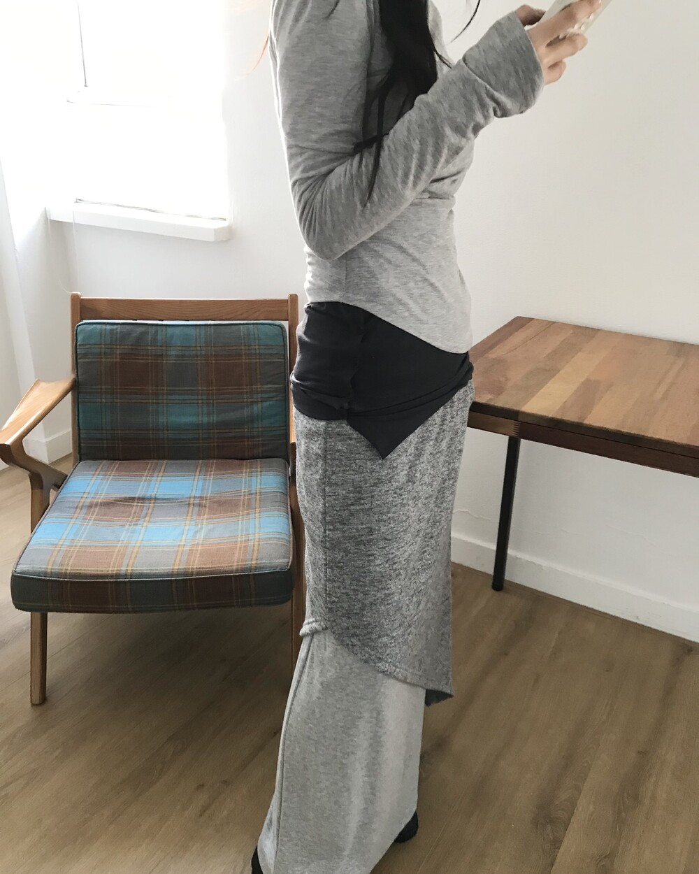 -밑단 언발 기장과 중간에 은은한 홀 디테일로 포인트를 준 디자인