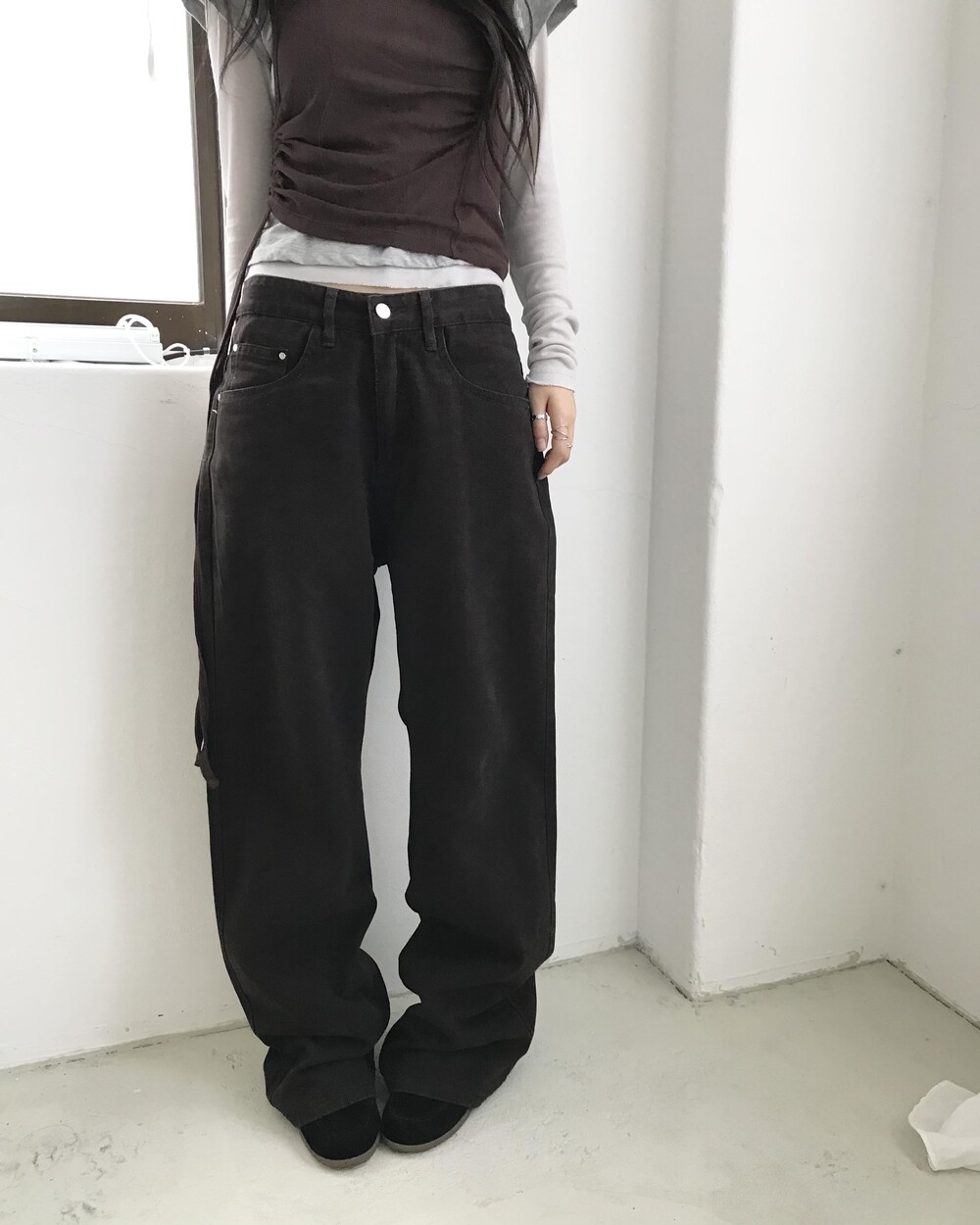 1 허리38.3 힙48 허벅지29.5 밑위29.5 밑단26.5 총장107 (단면 cm)