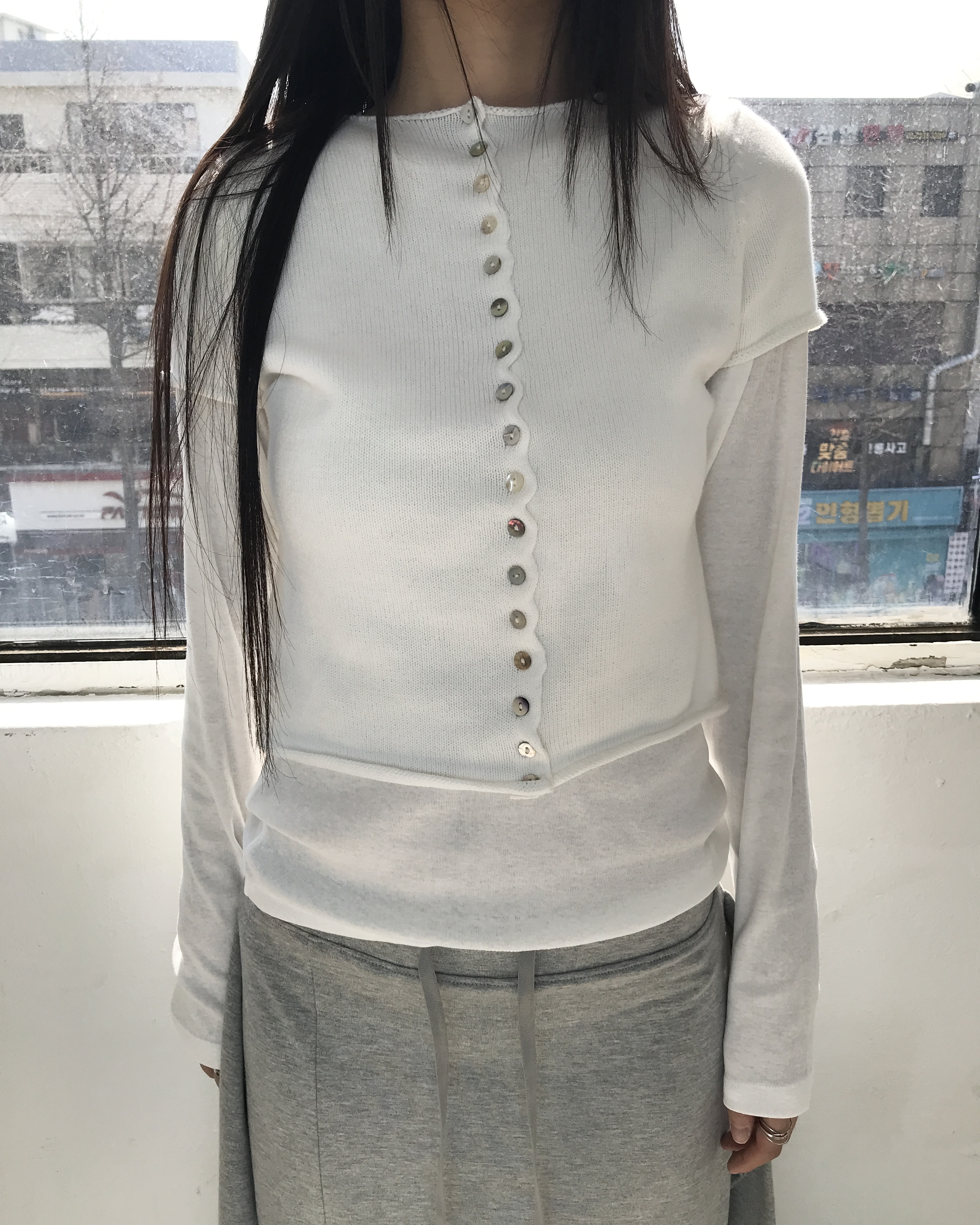 -자개 버튼 디테일이 포인트가 되는 하프 니트 가디건