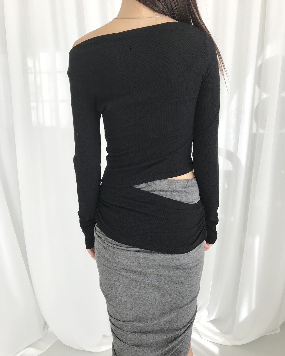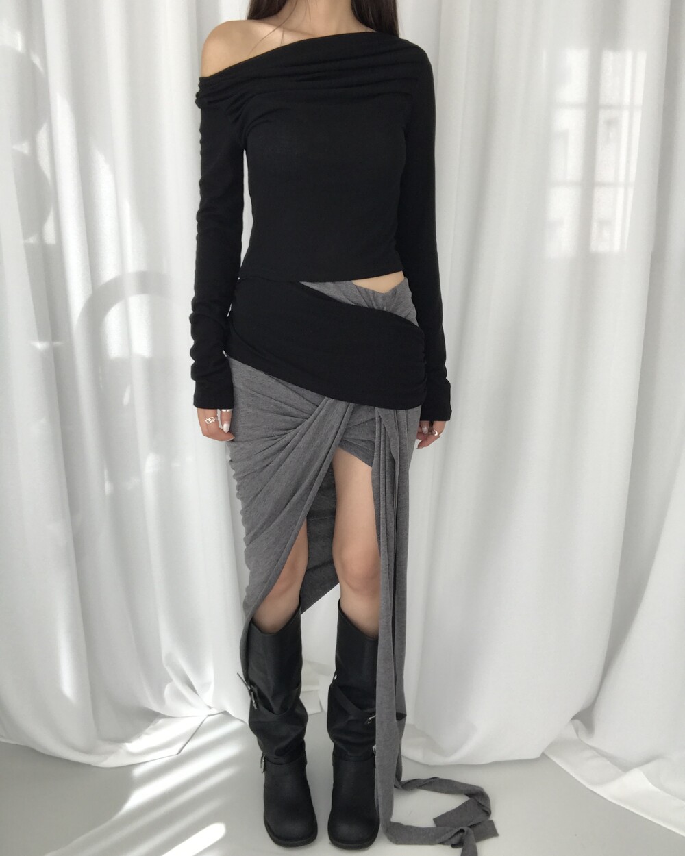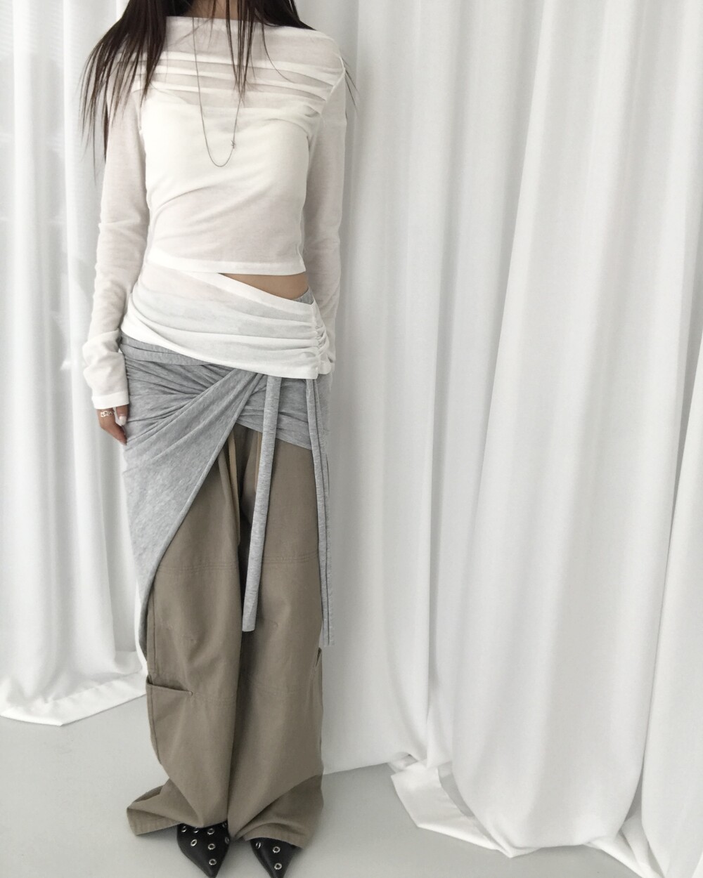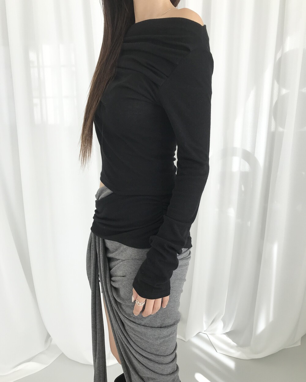 -대각선 실루엣과 흘러내린 듯한 드레이프 디테일로 만들어내는 입체적인 볼륨감