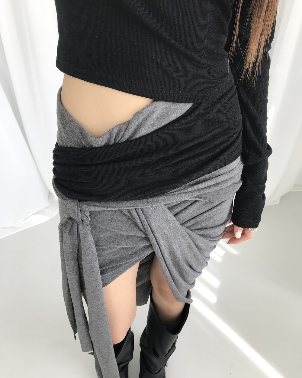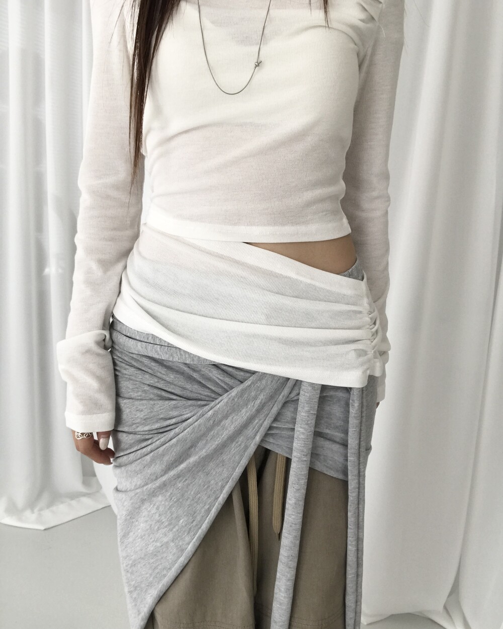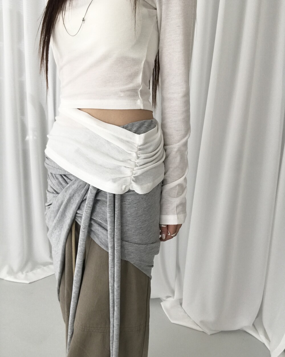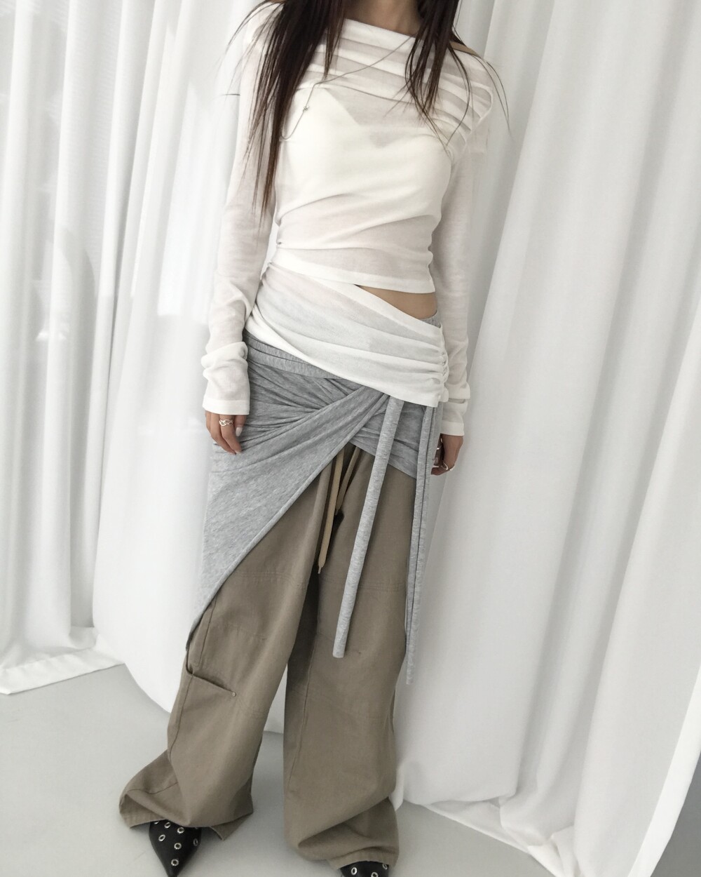 -대각선 실루엣과 흘러내린 듯한 드레이프 디테일로 만들어내는 입체적인 볼륨감