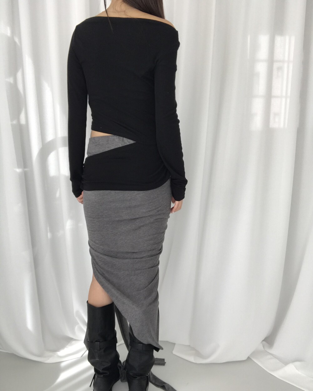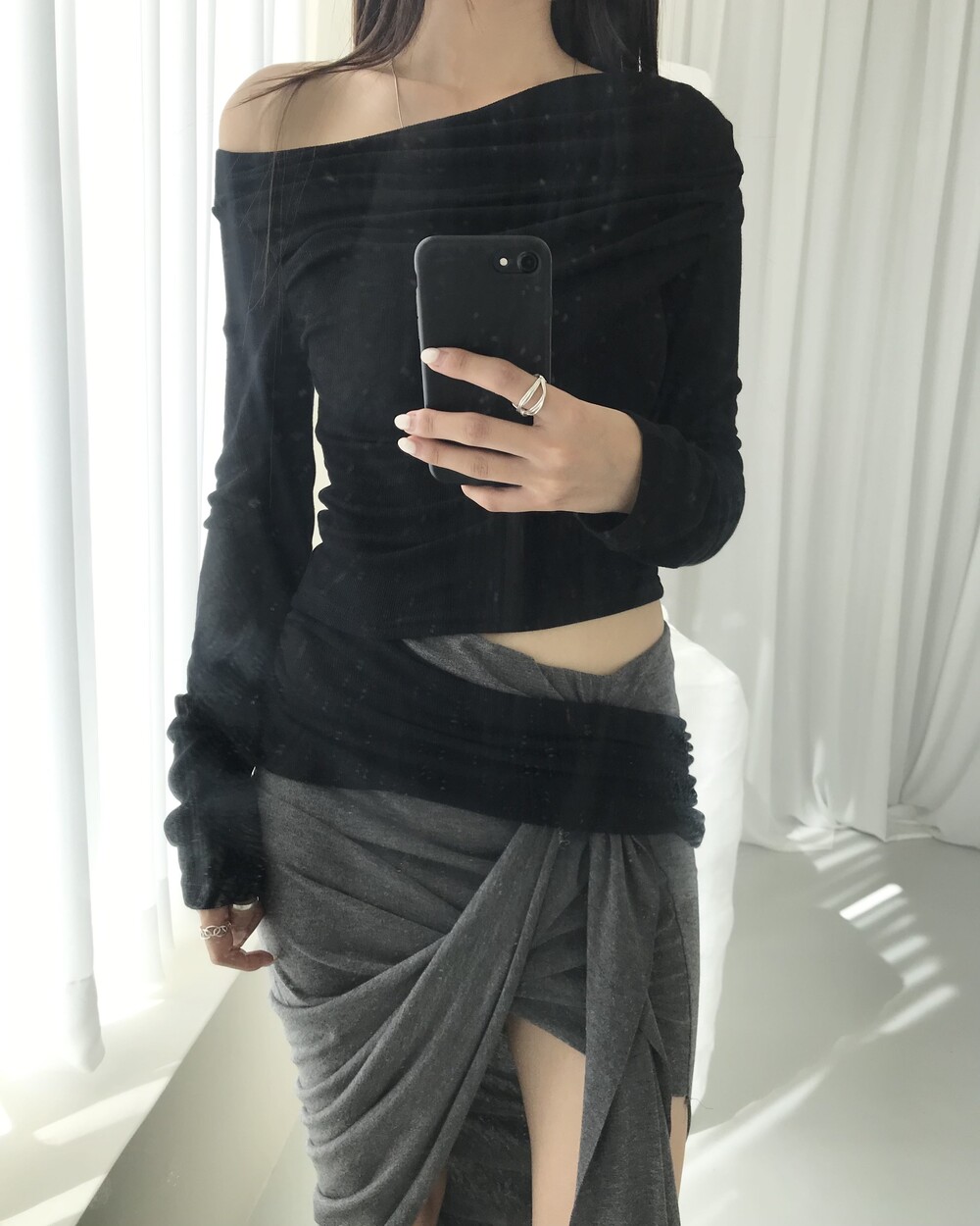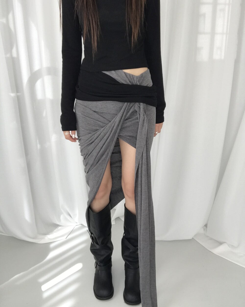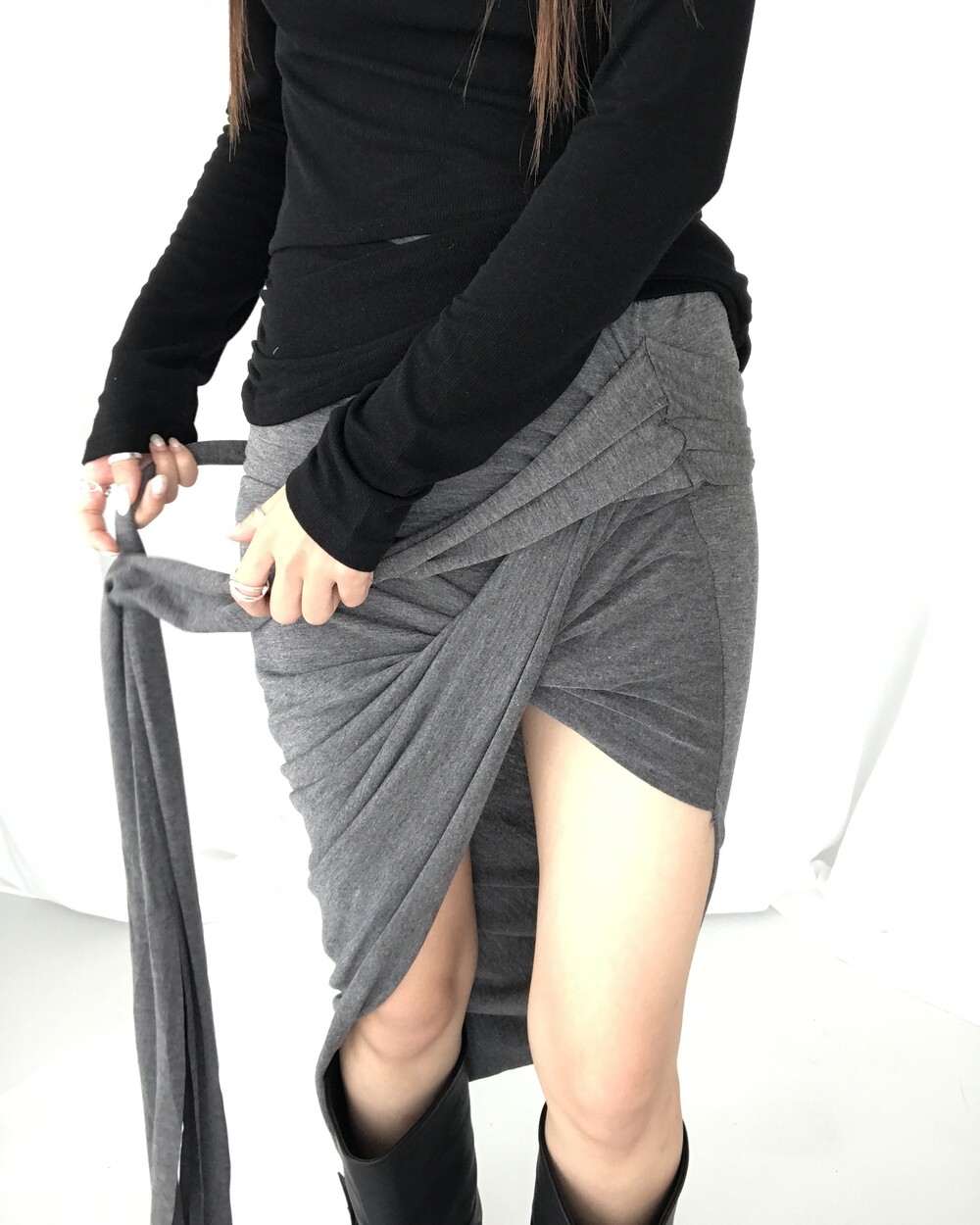 -대각선 실루엣과 흘러내린 듯한 드레이프 디테일로 만들어내는 입체적인 볼륨감