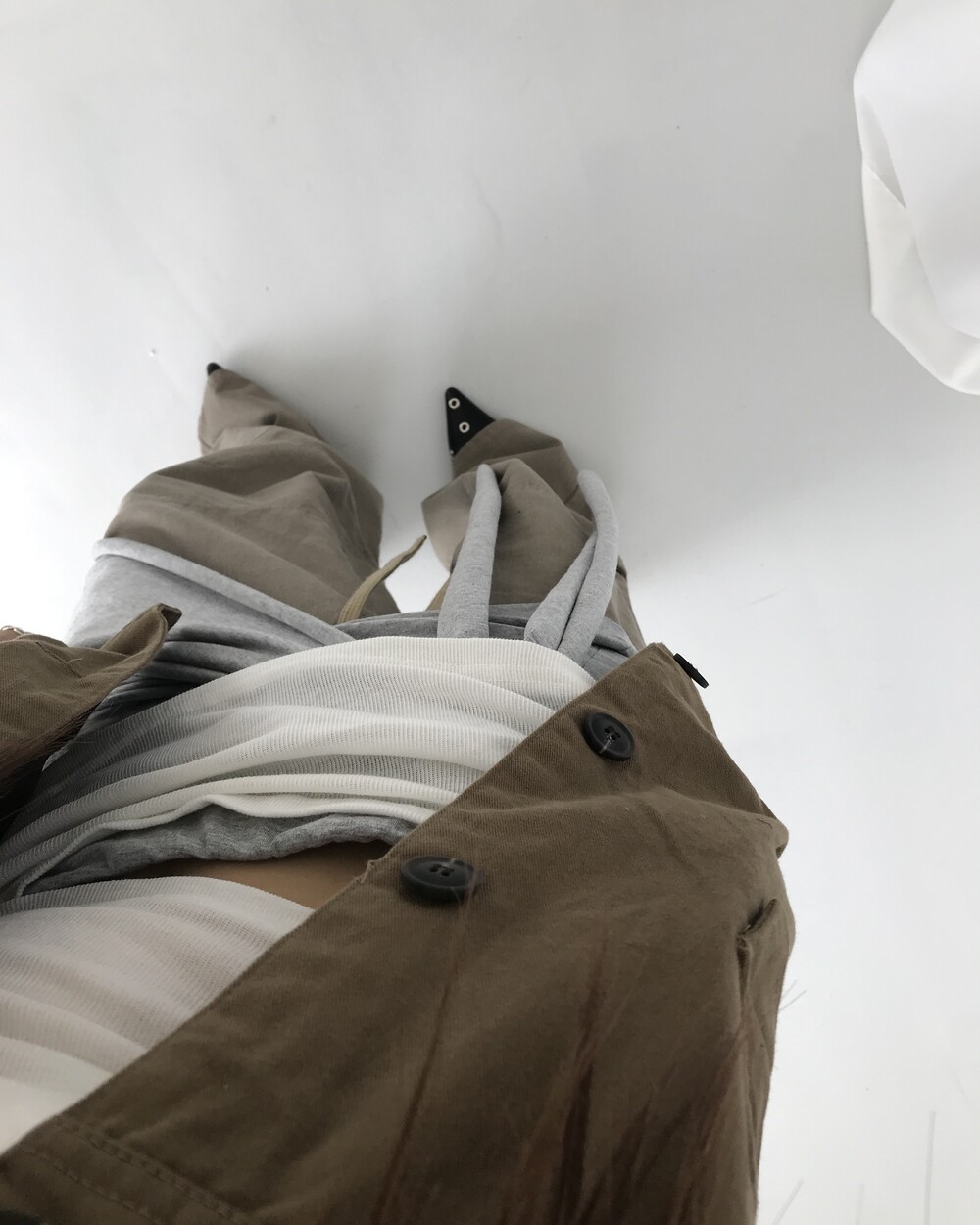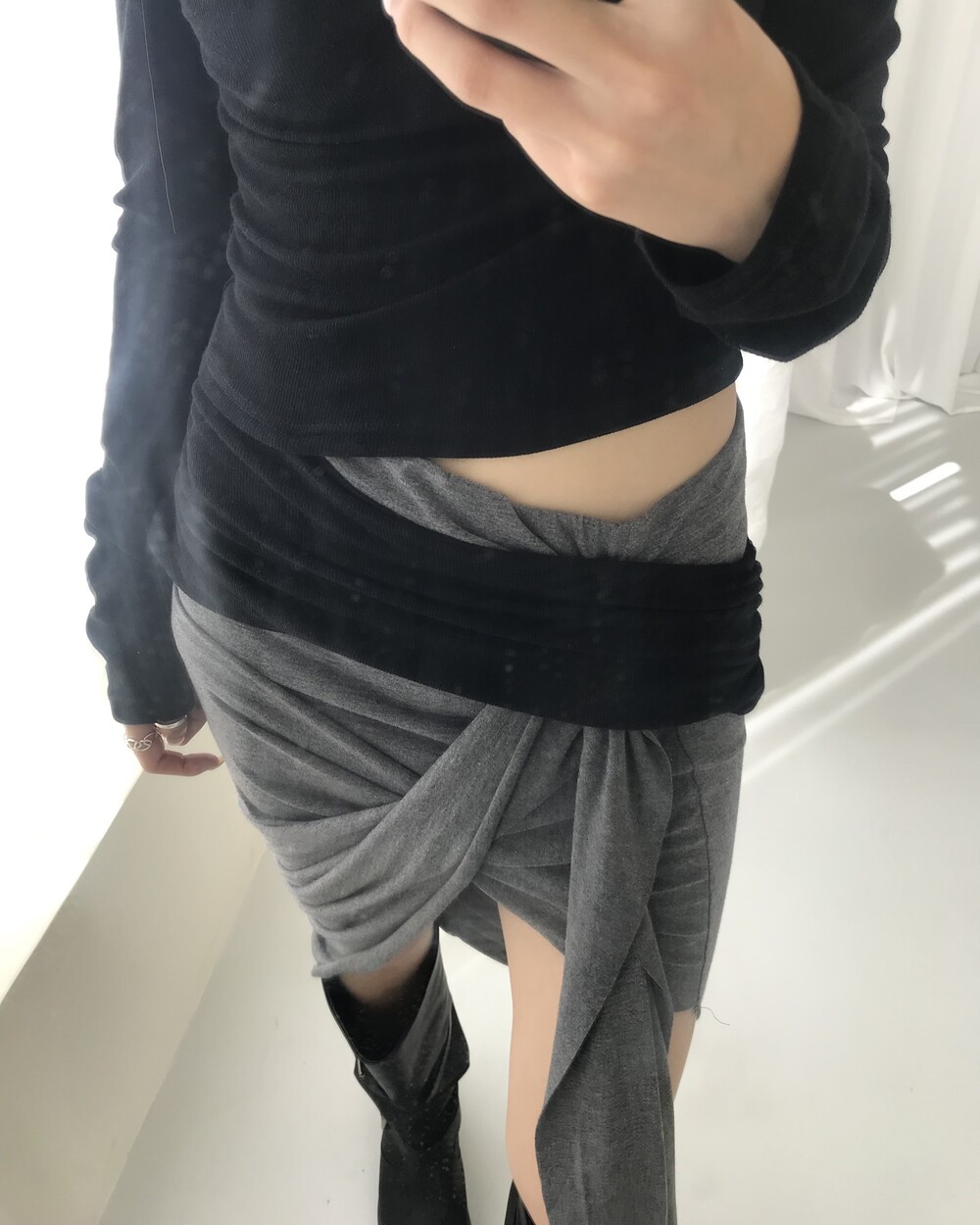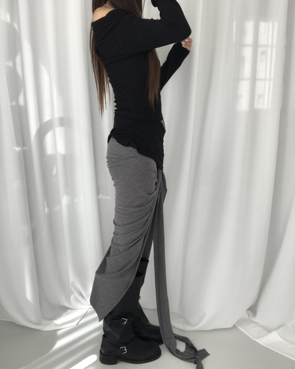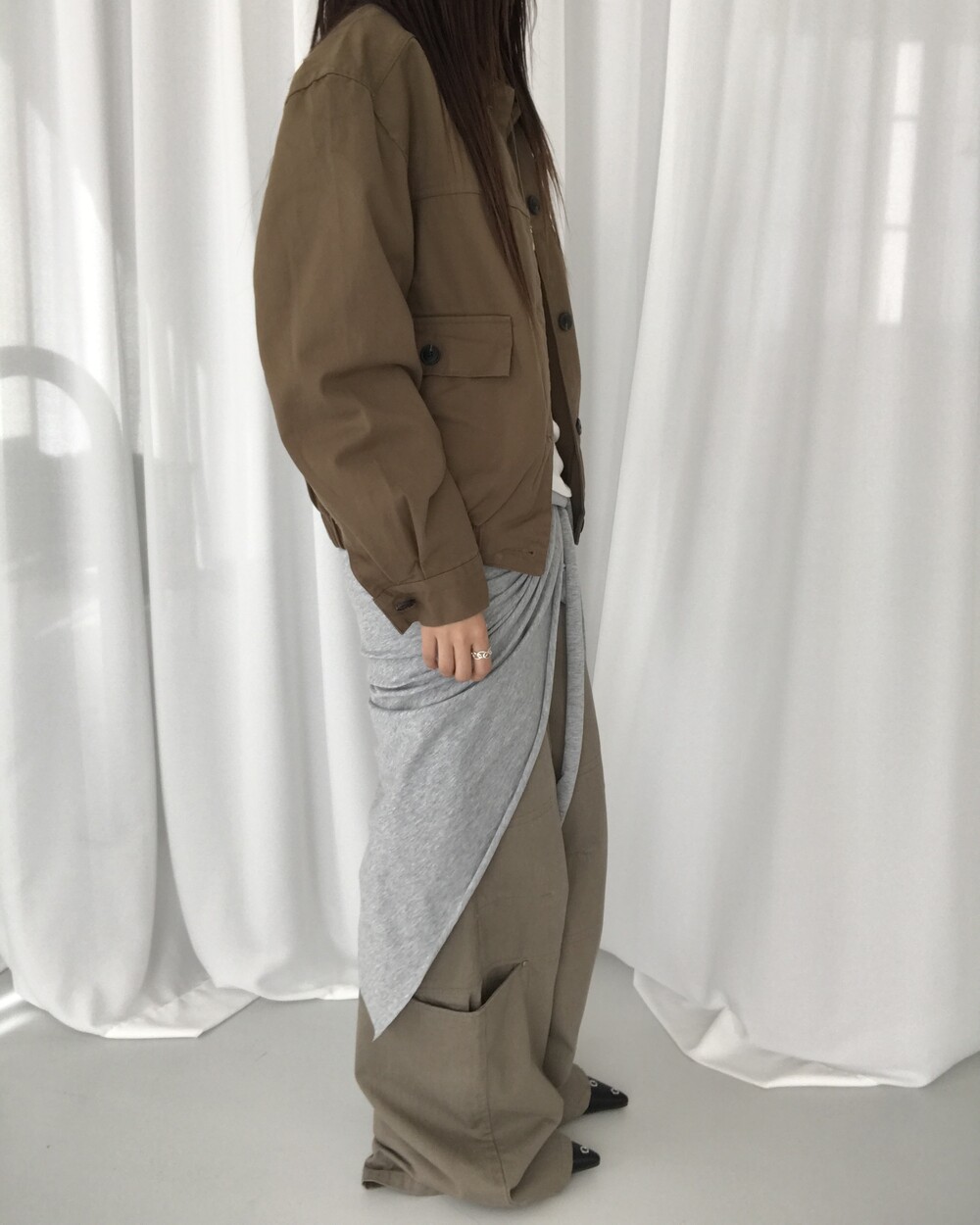 -대각선 실루엣과 흘러내린 듯한 드레이프 디테일로 만들어내는 입체적인 볼륨감