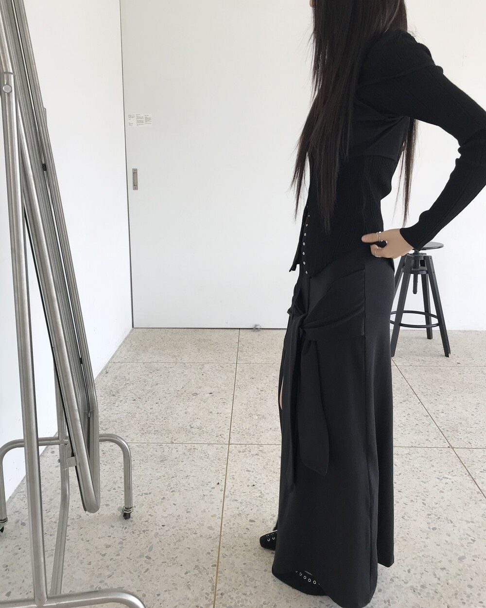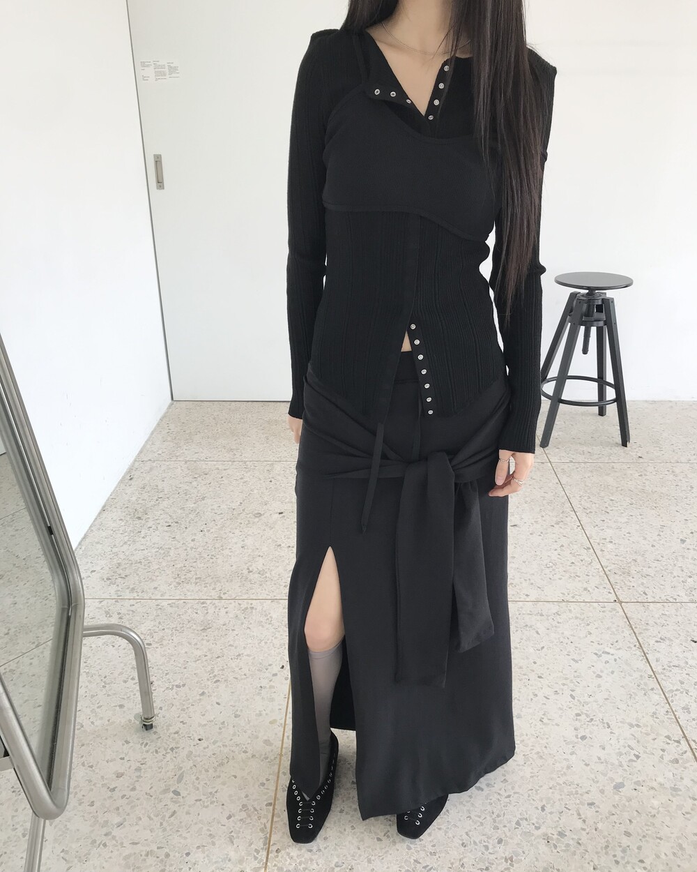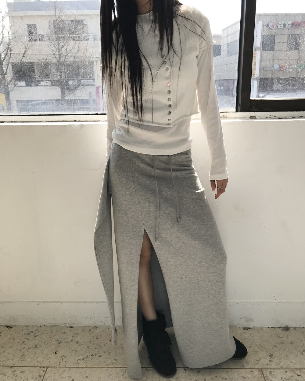 -슬림한 실루엣이 돋보이는 져지 롱 스커트