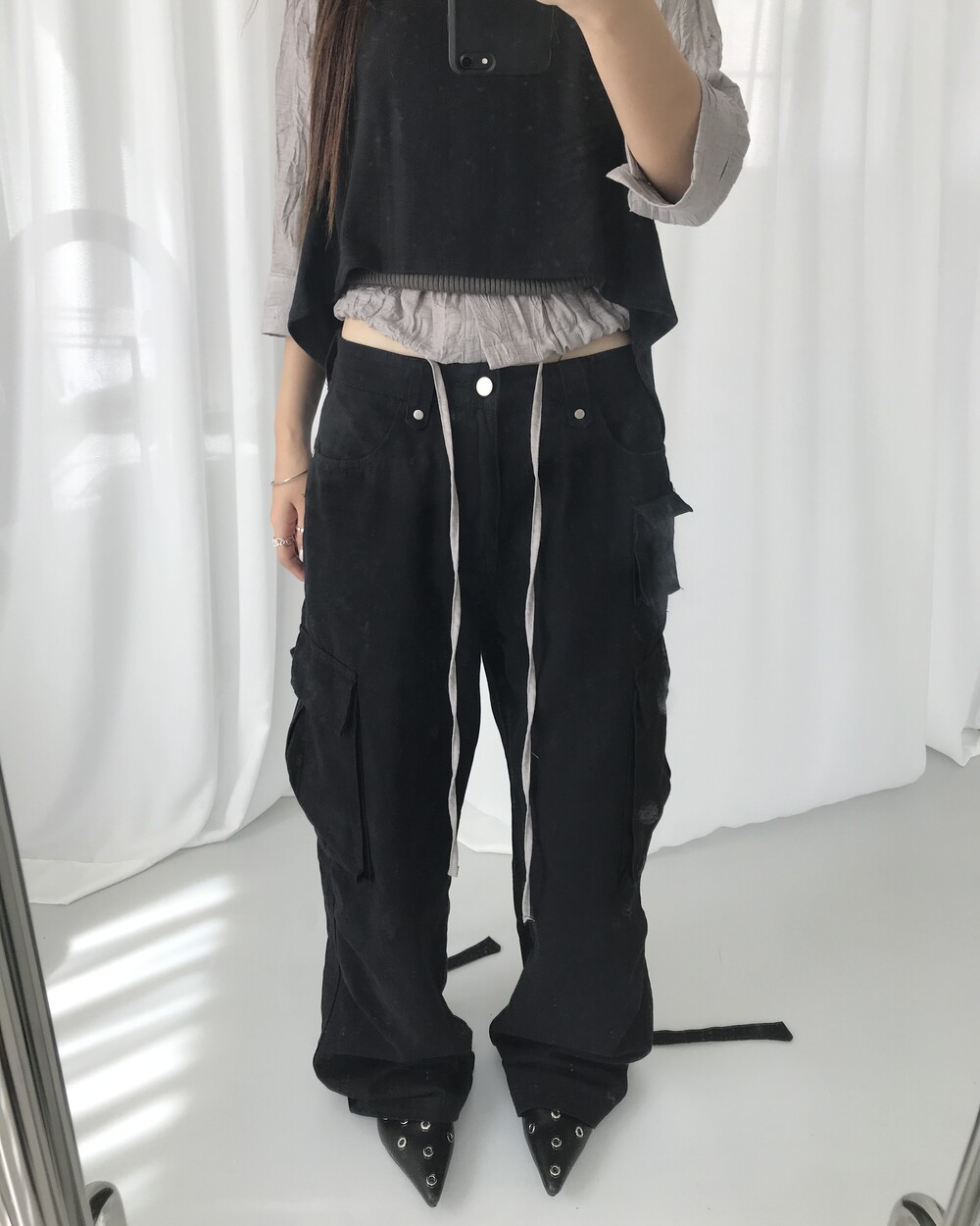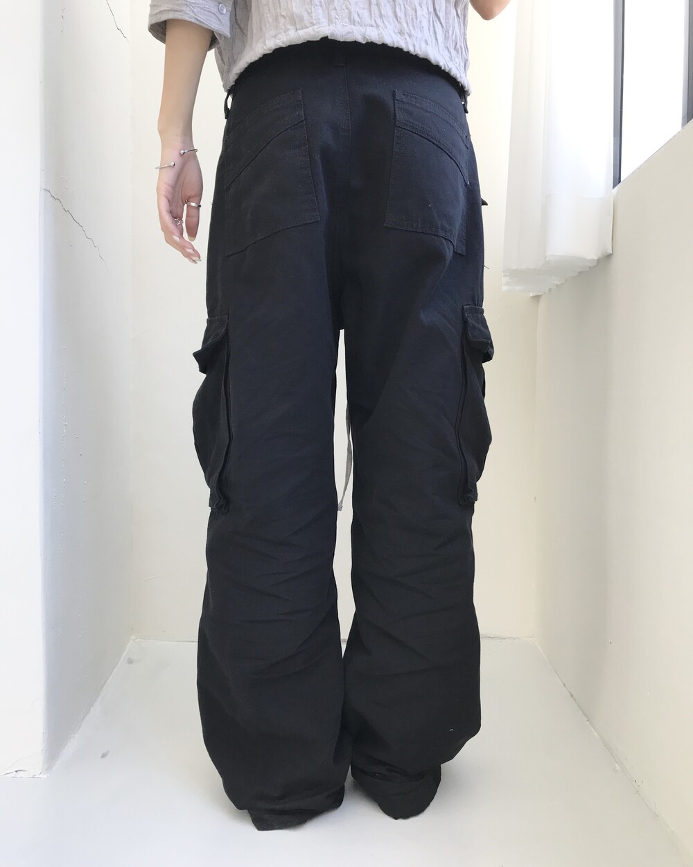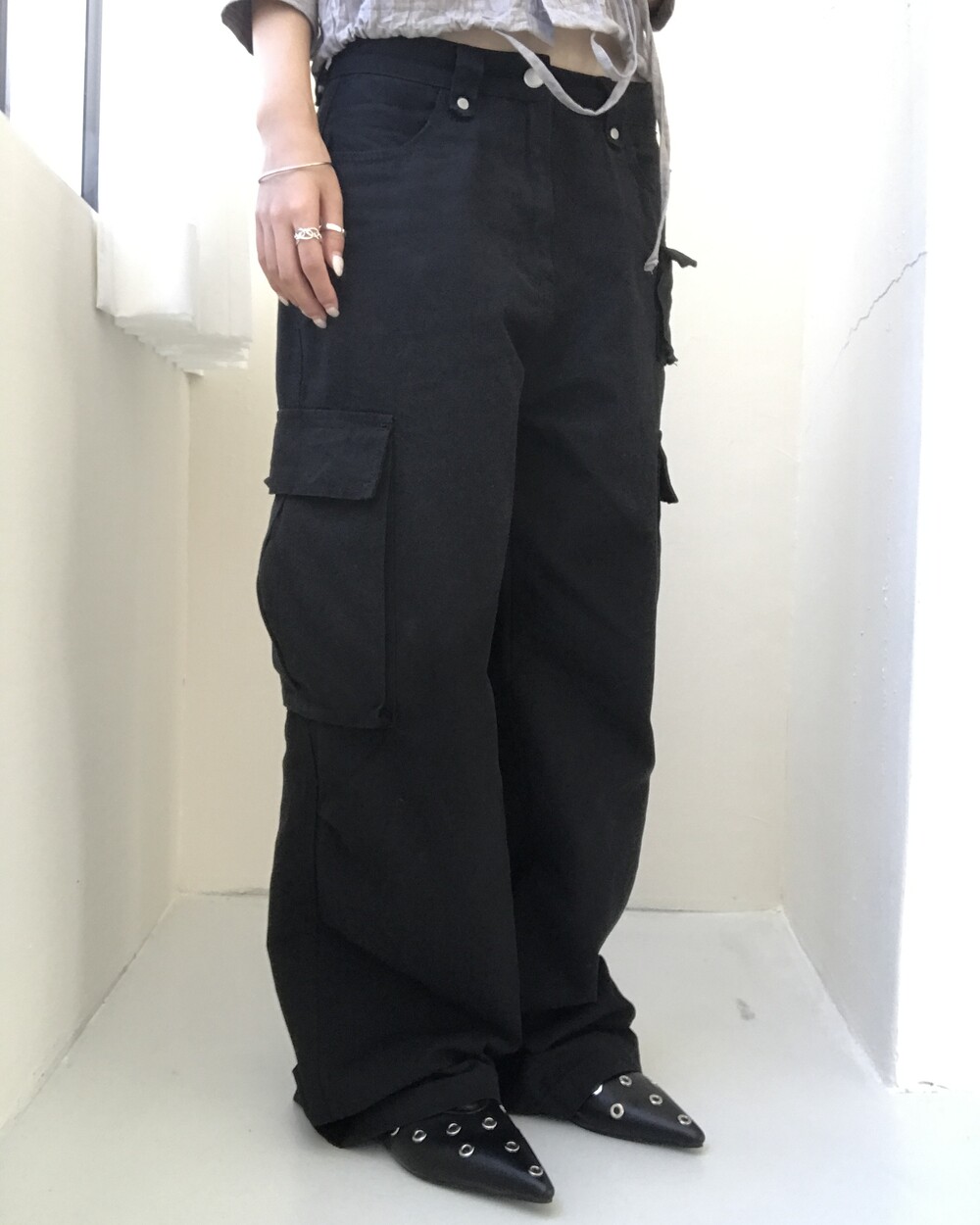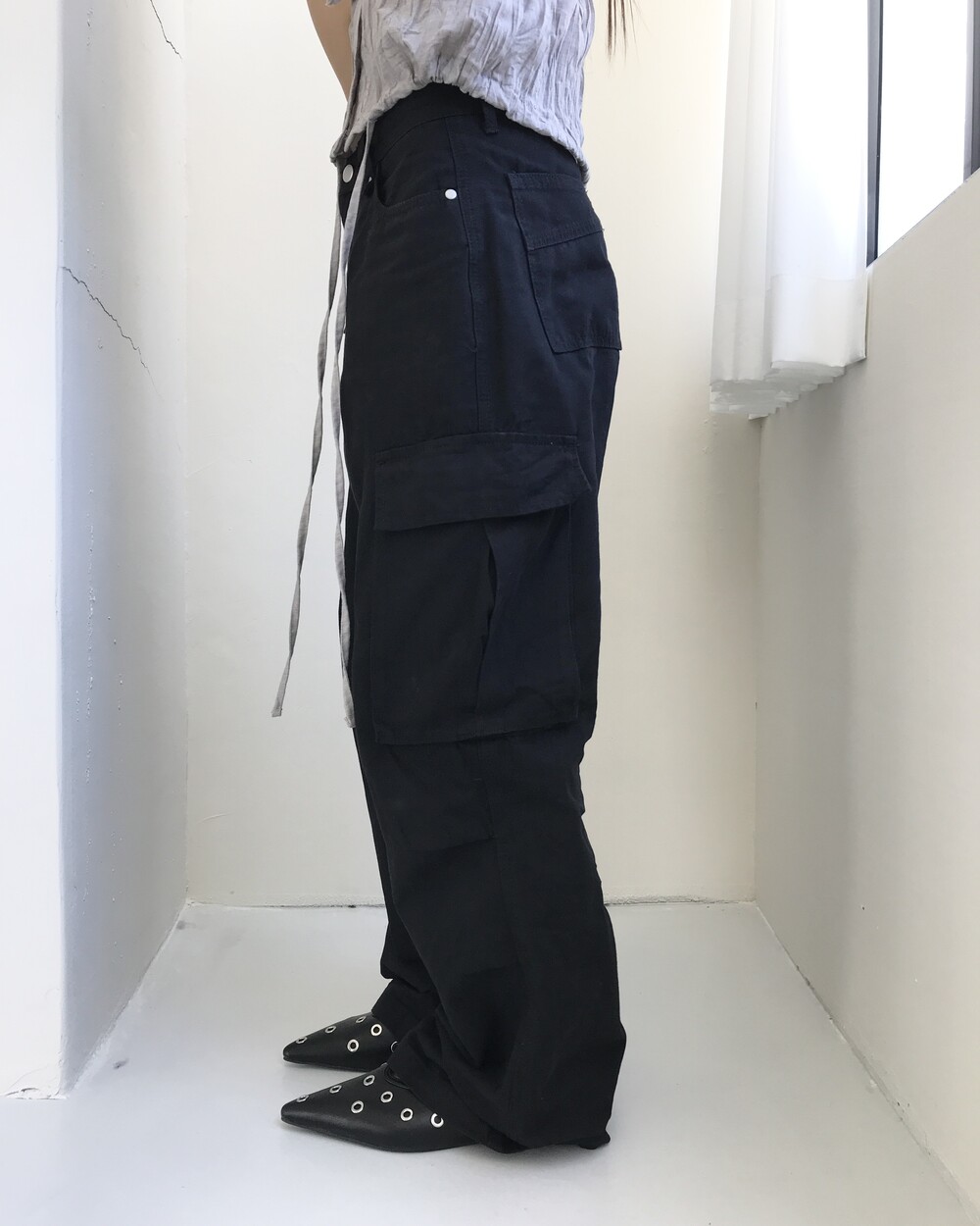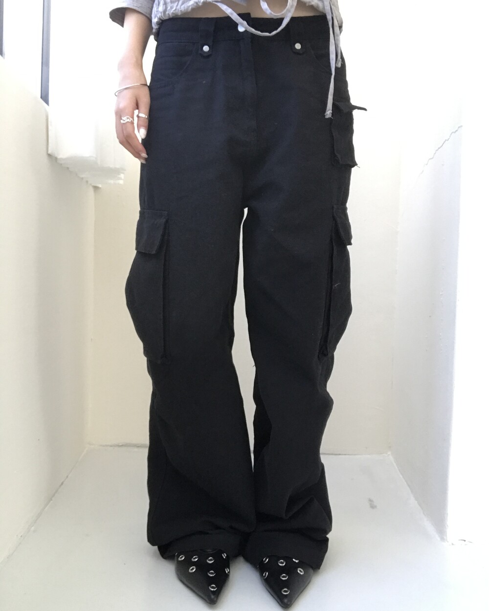 -로우웨이스트 실루엣의 롱 기장 카고 팬츠