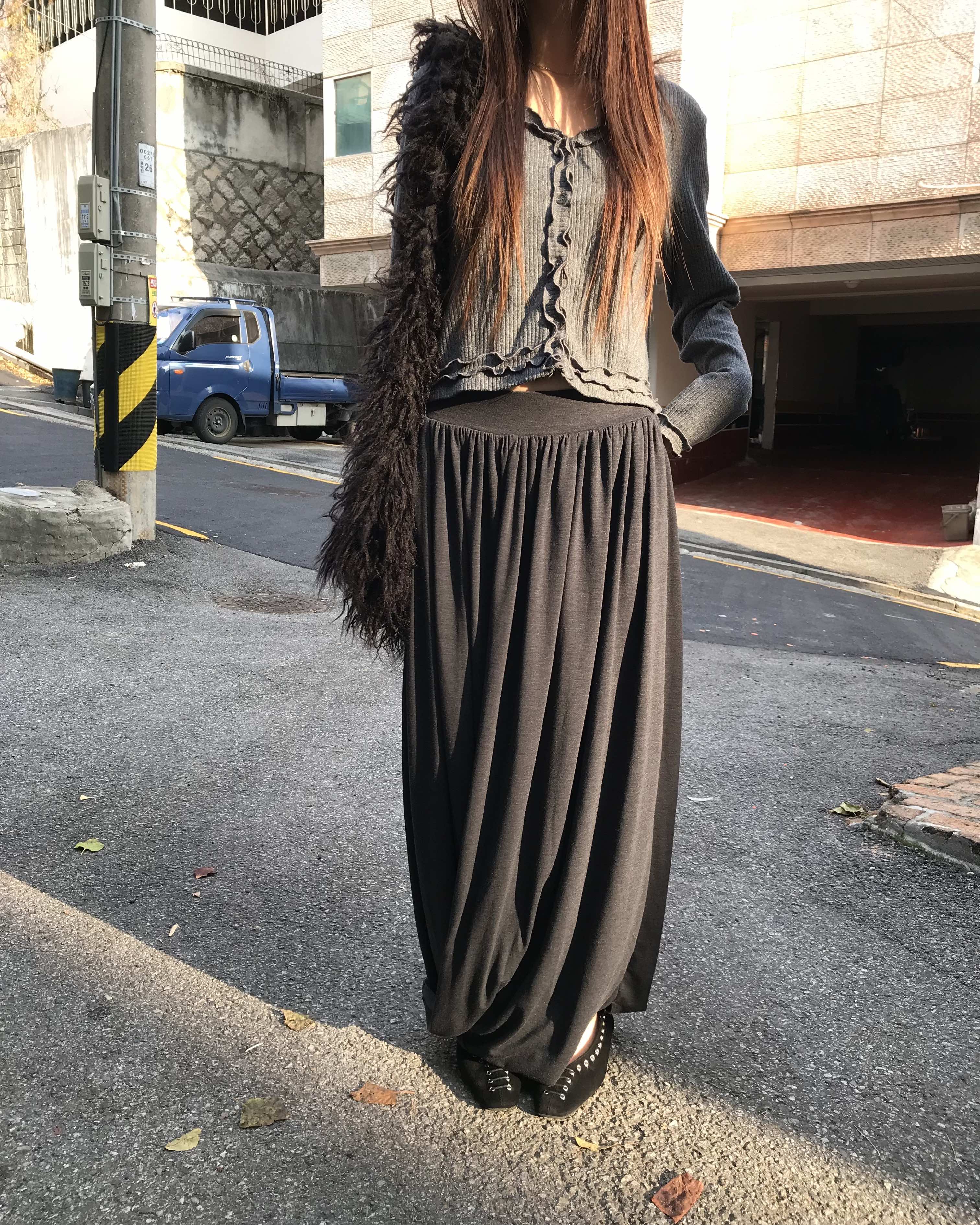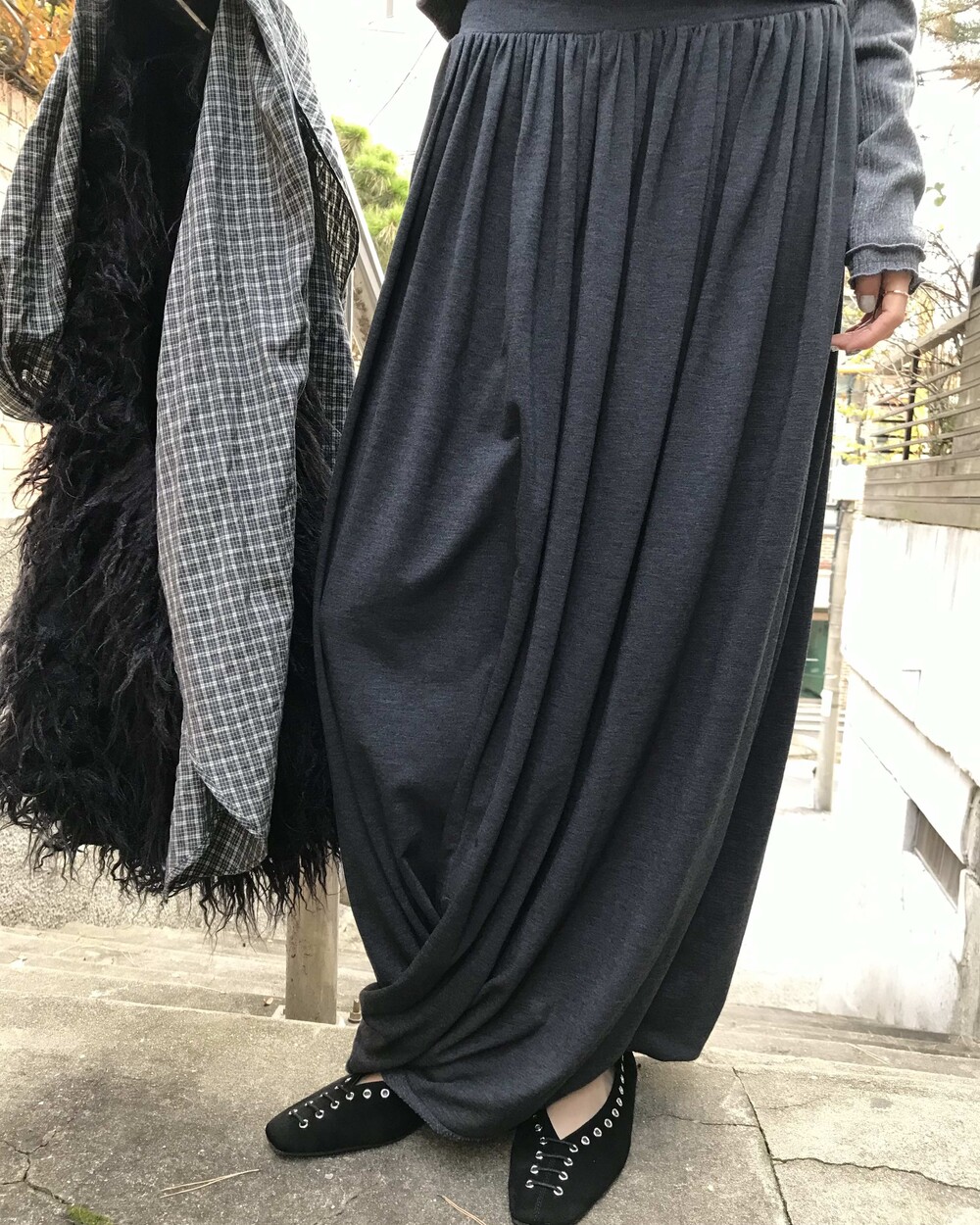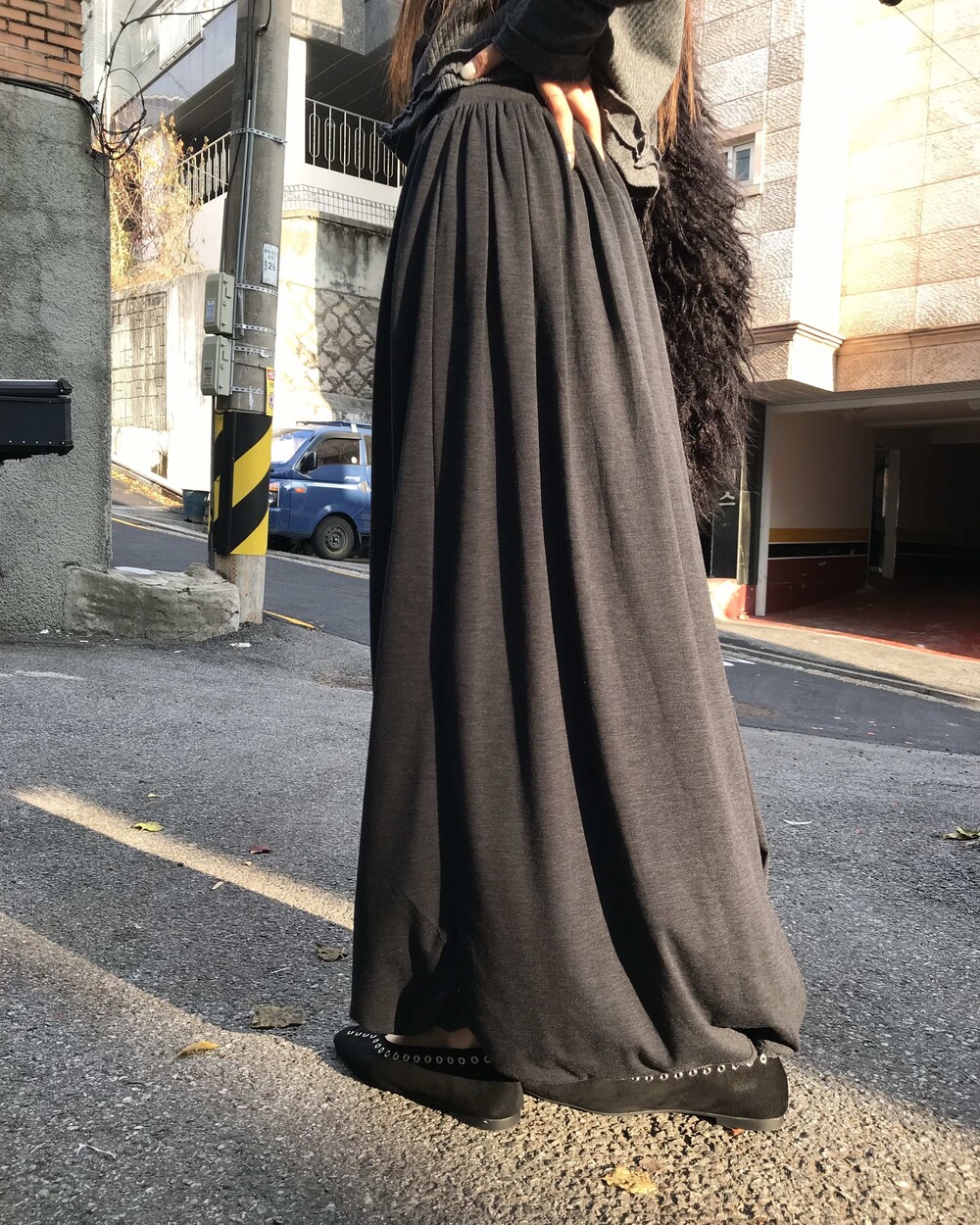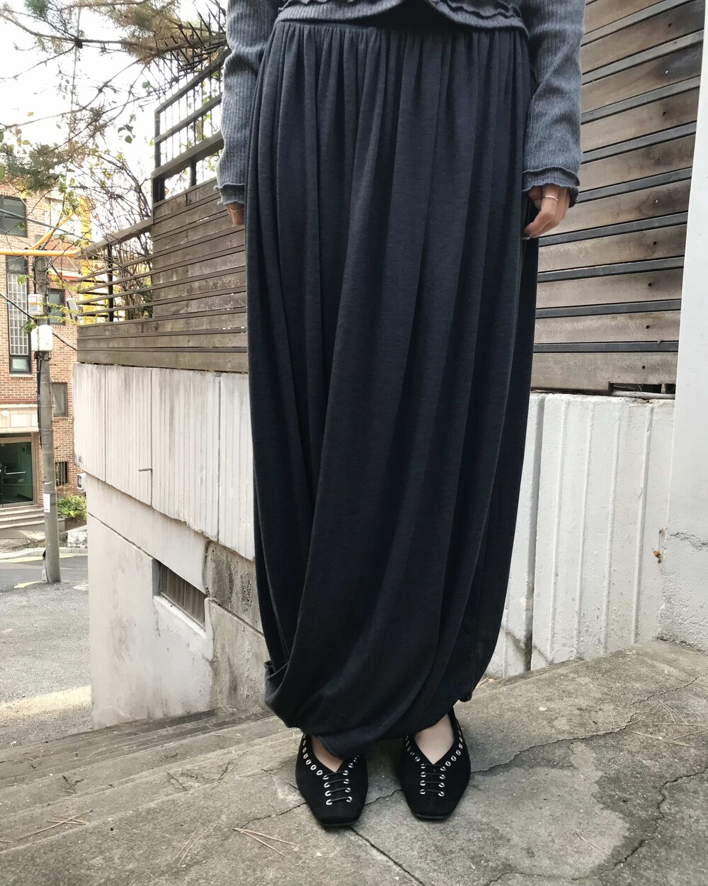 밑단이 살짝 오므라지며 벌룬처럼 완성되는 맥시 스커트