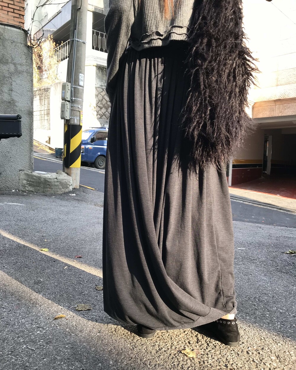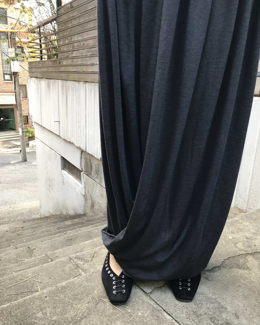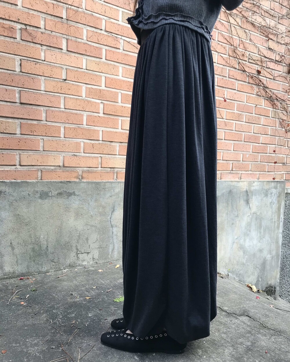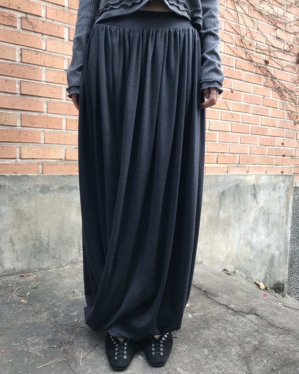 밑단이 살짝 오므라지며 벌룬처럼 완성되는 맥시 스커트