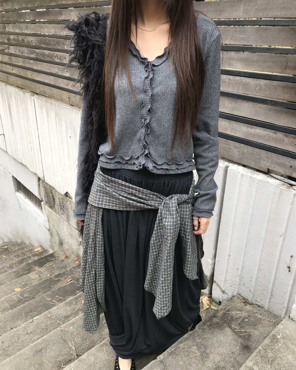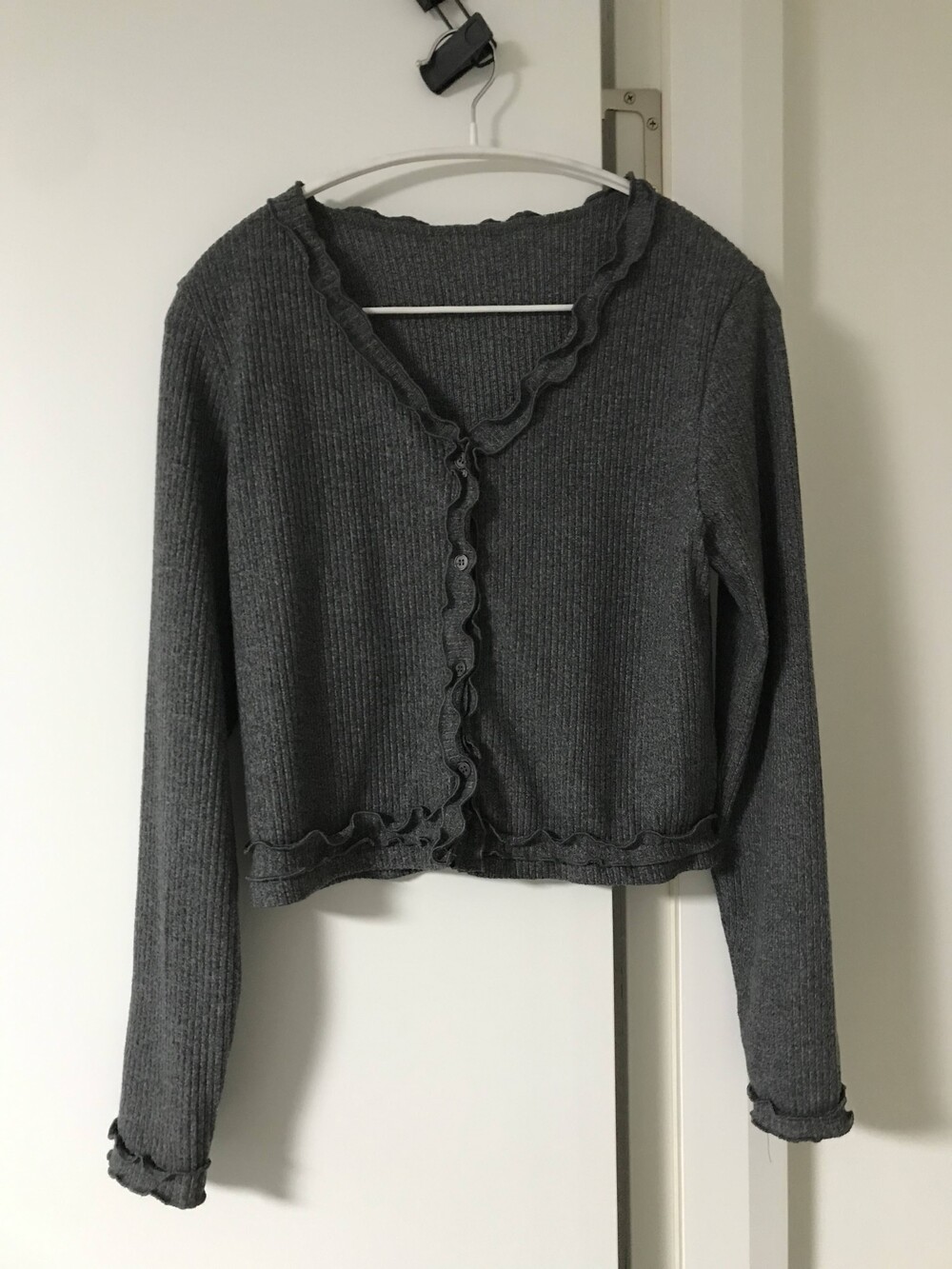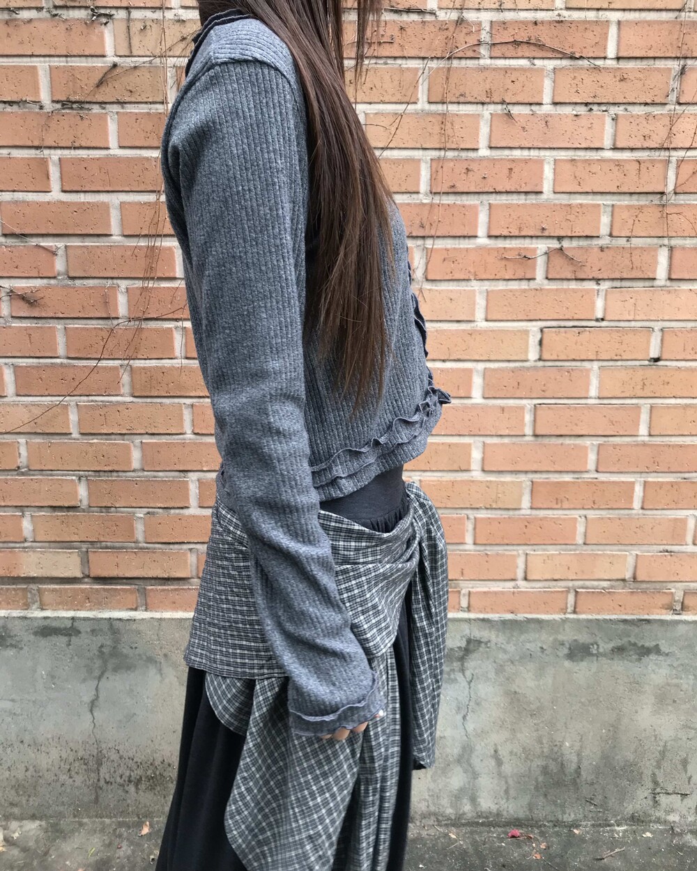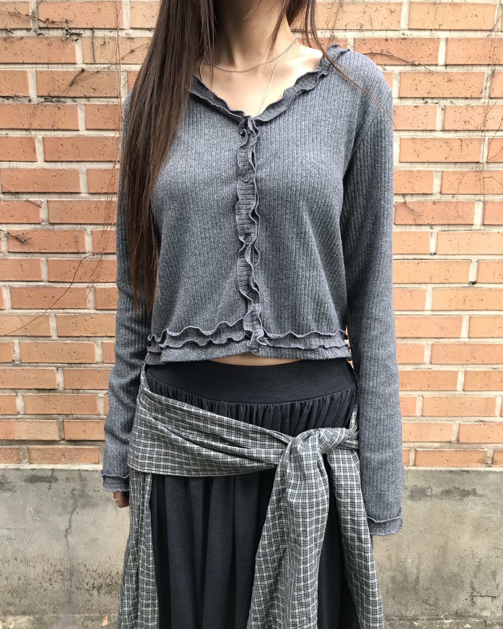 -골지 텍스처 위로 프릴 라인이 더해진 사랑스러운 분위기의 가디건