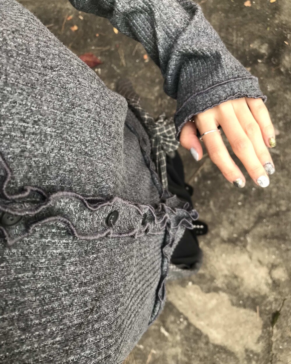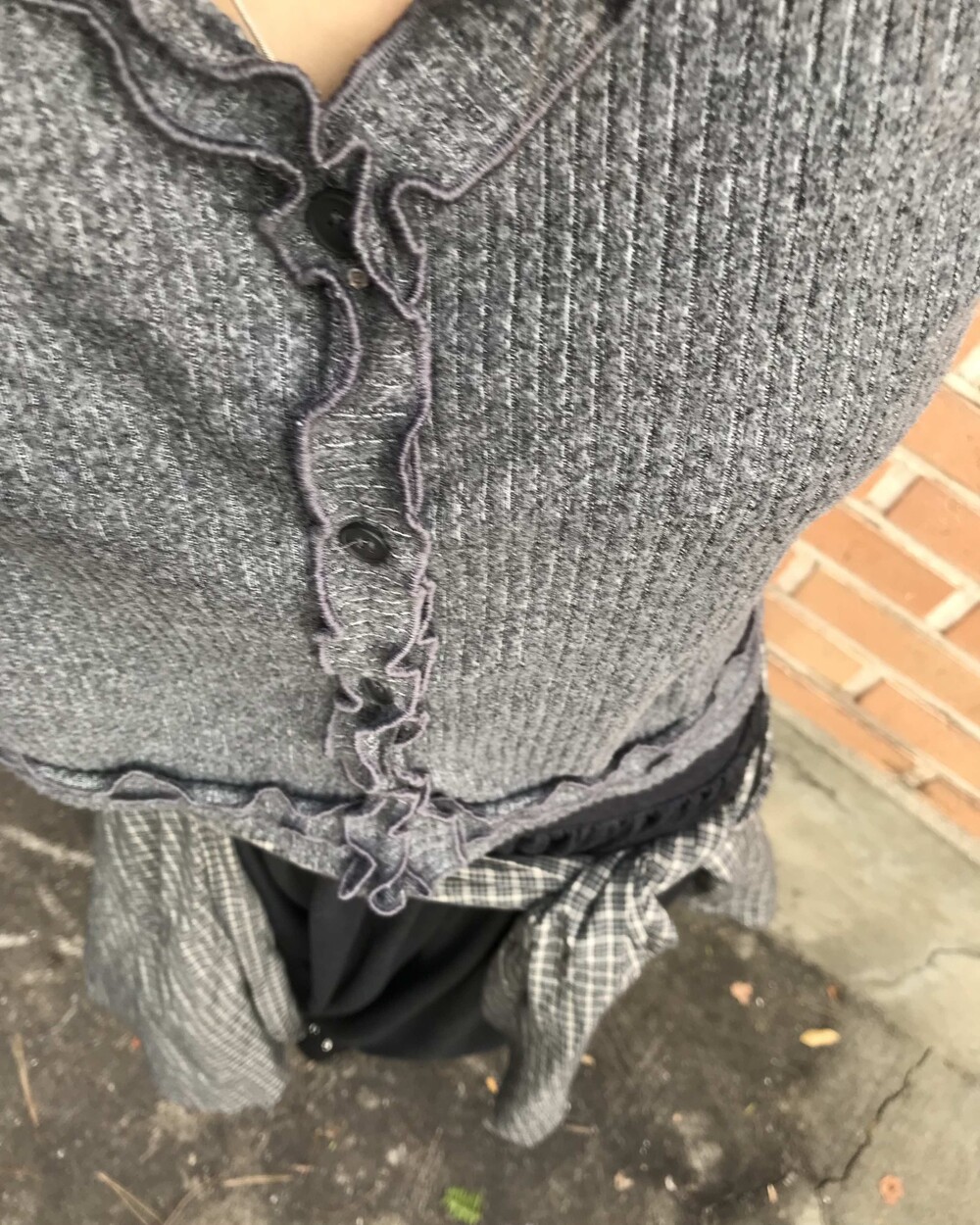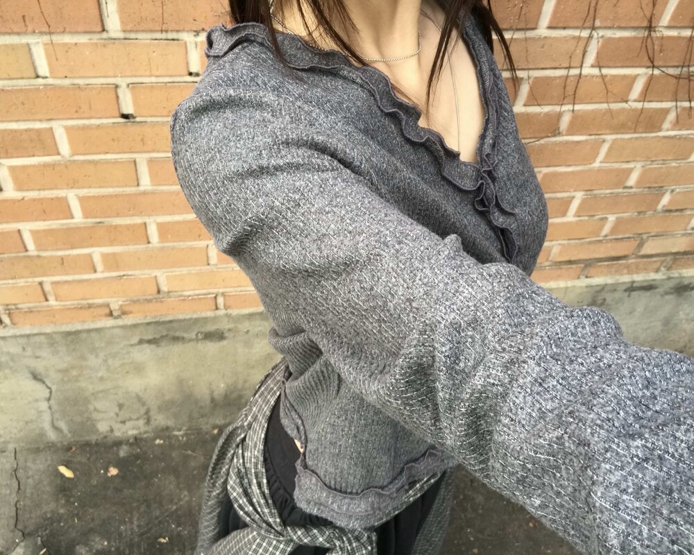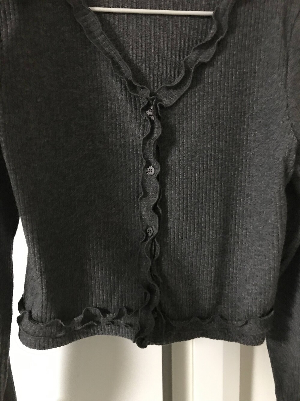 -골지 텍스처 위로 프릴 라인이 더해진 사랑스러운 분위기의 가디건