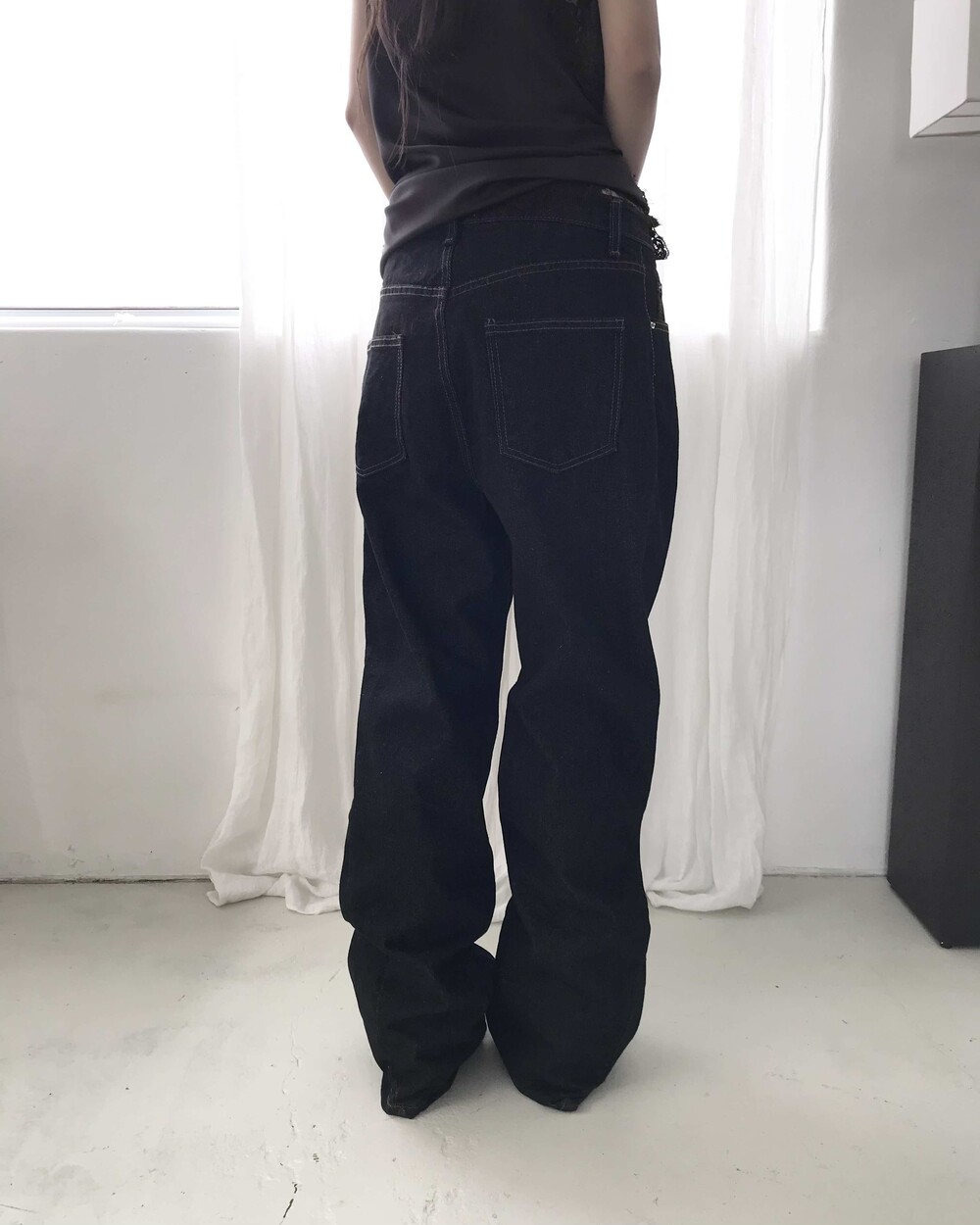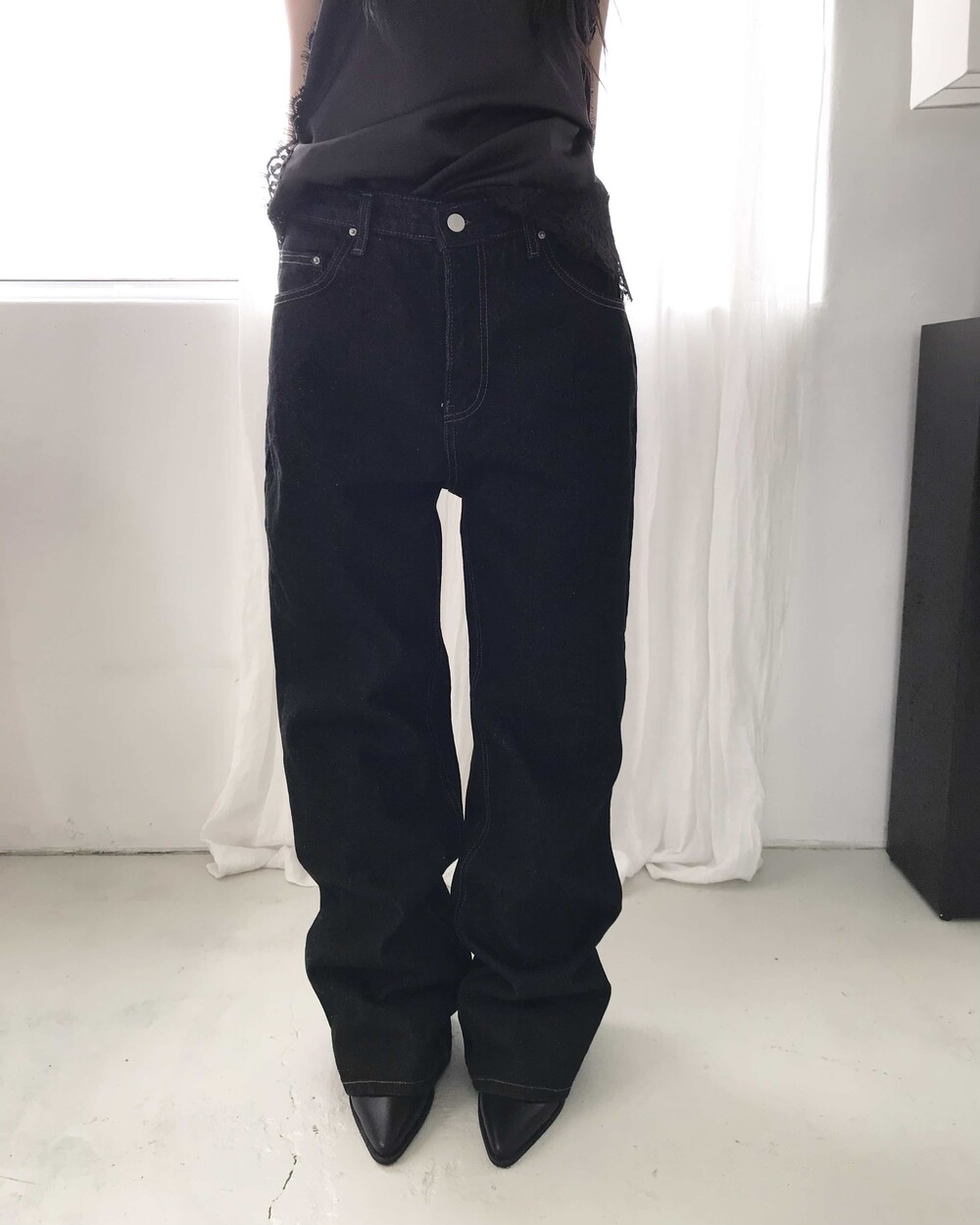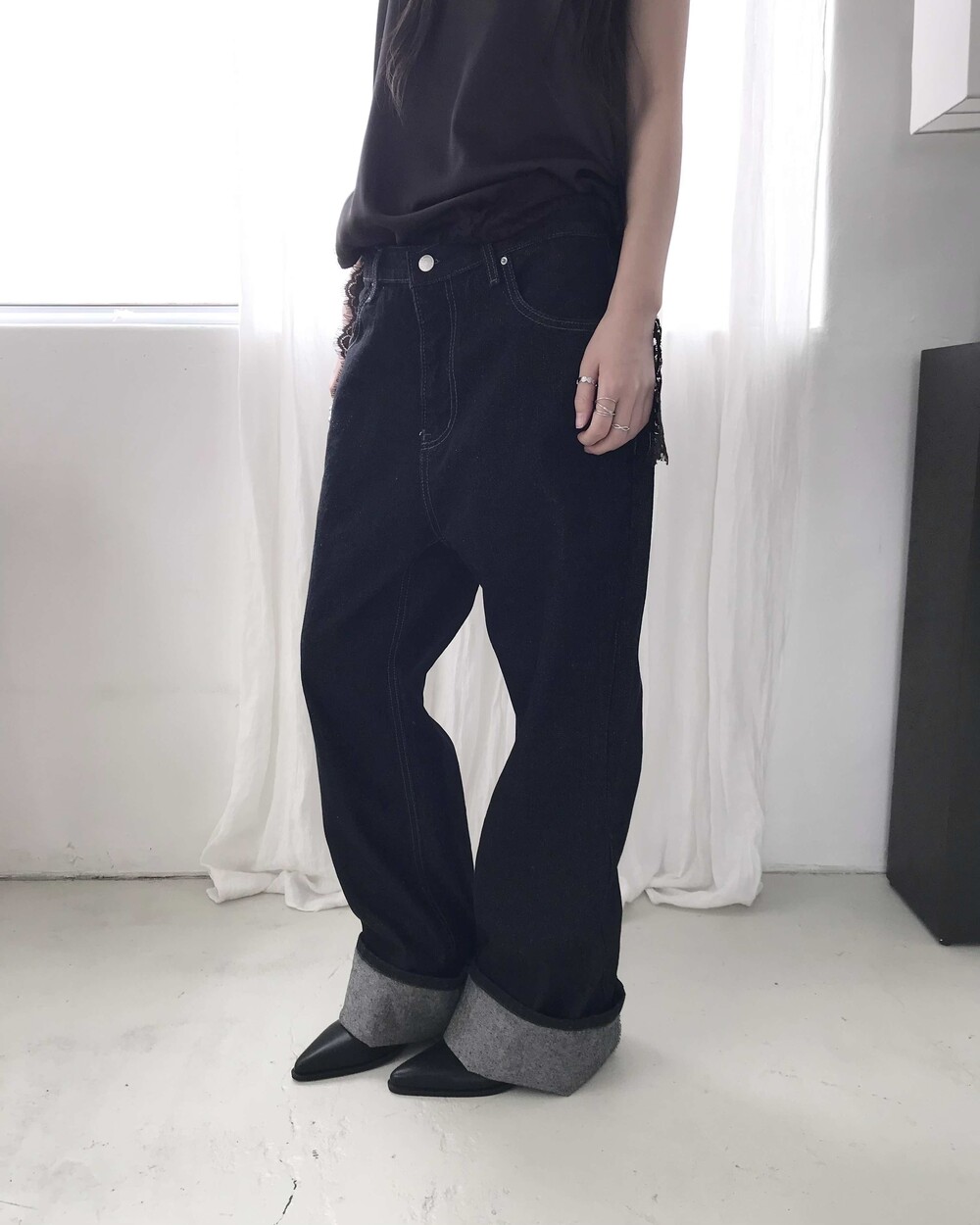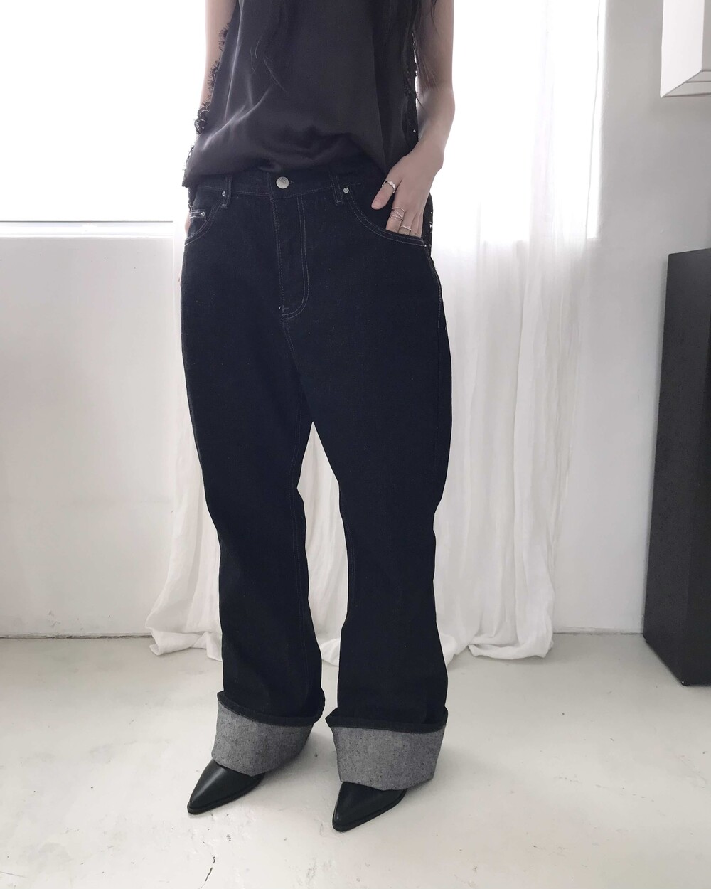 -밑단을 접어 연출하기 좋으며 생지 데님 특성상 이염 주의가 필요한 제품