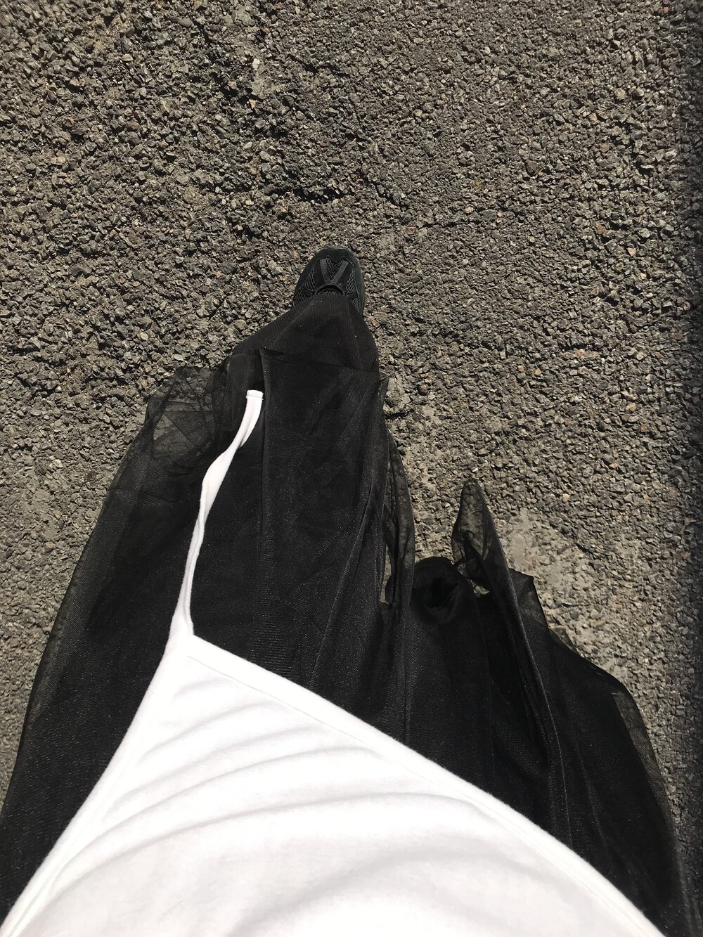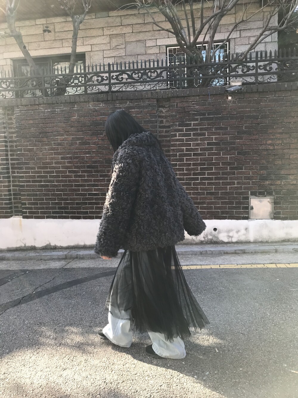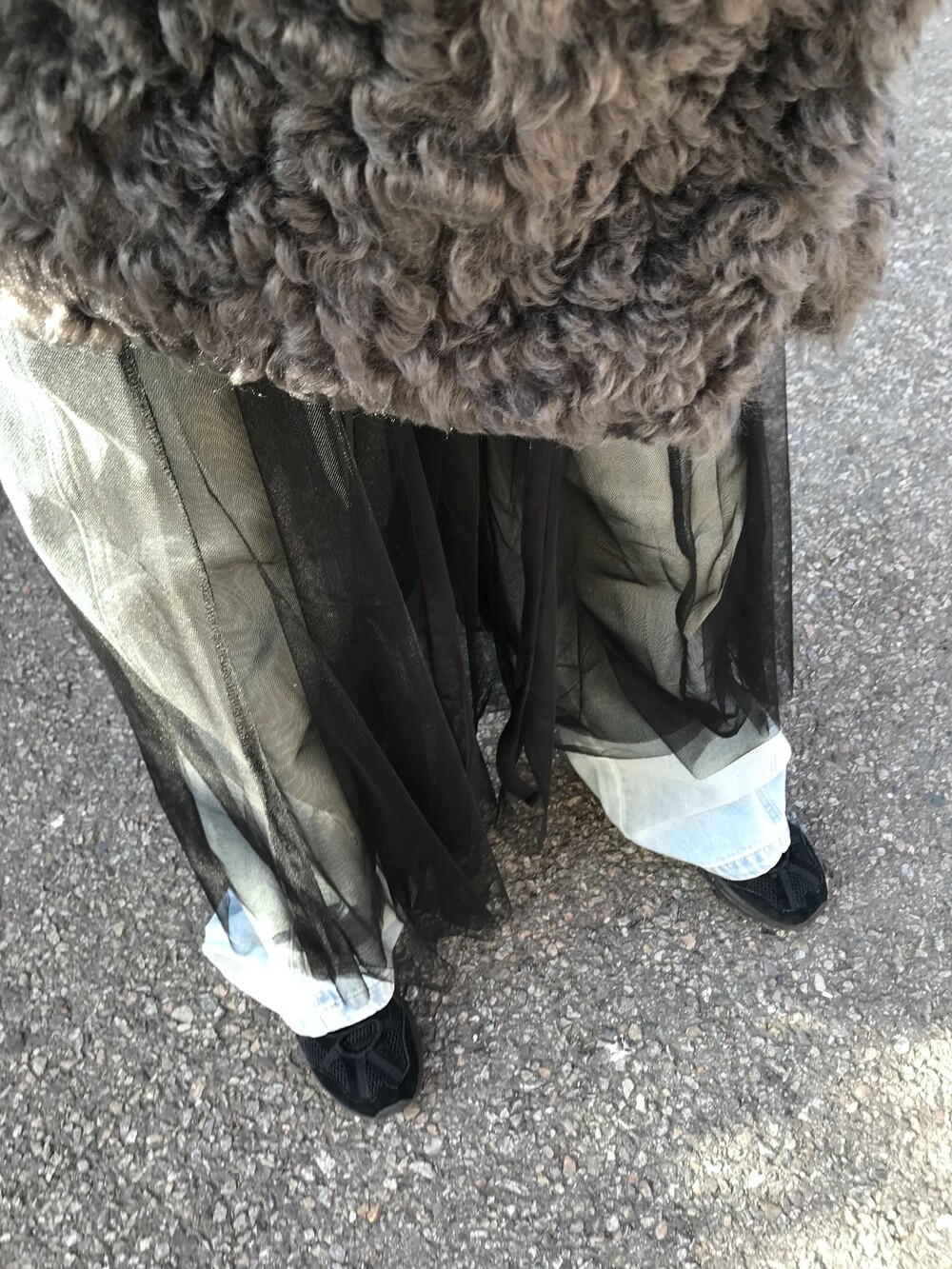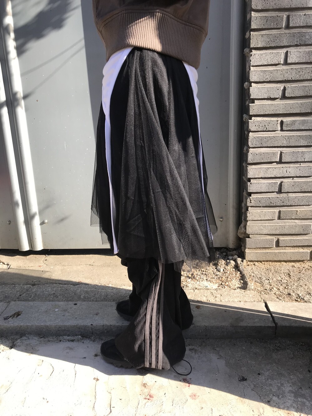 -이중으로 레이어드된 샤 스커트로 걸을 때